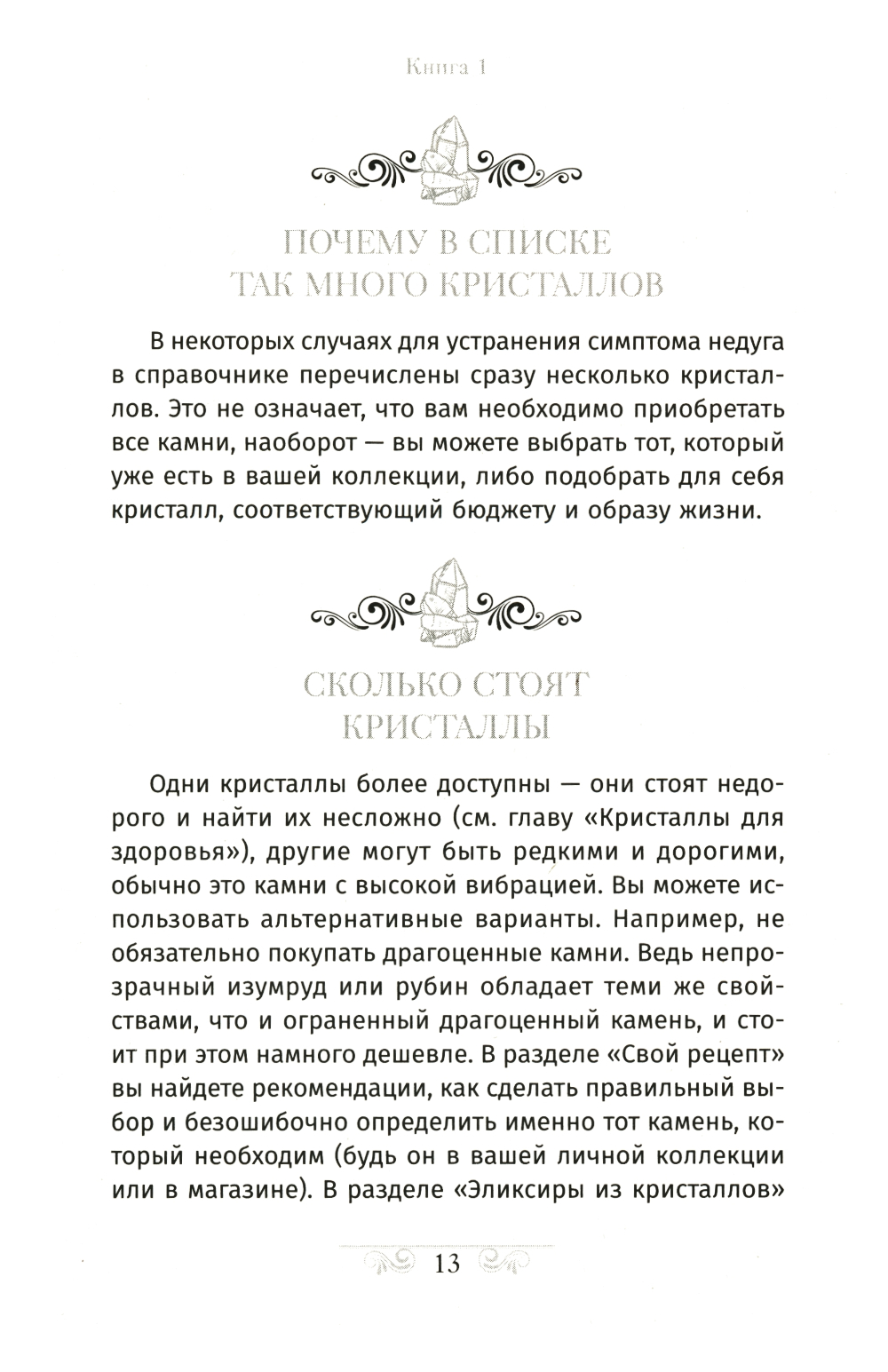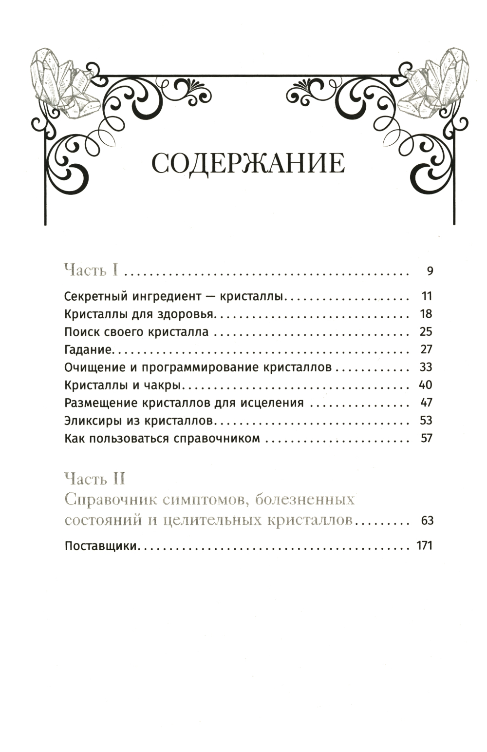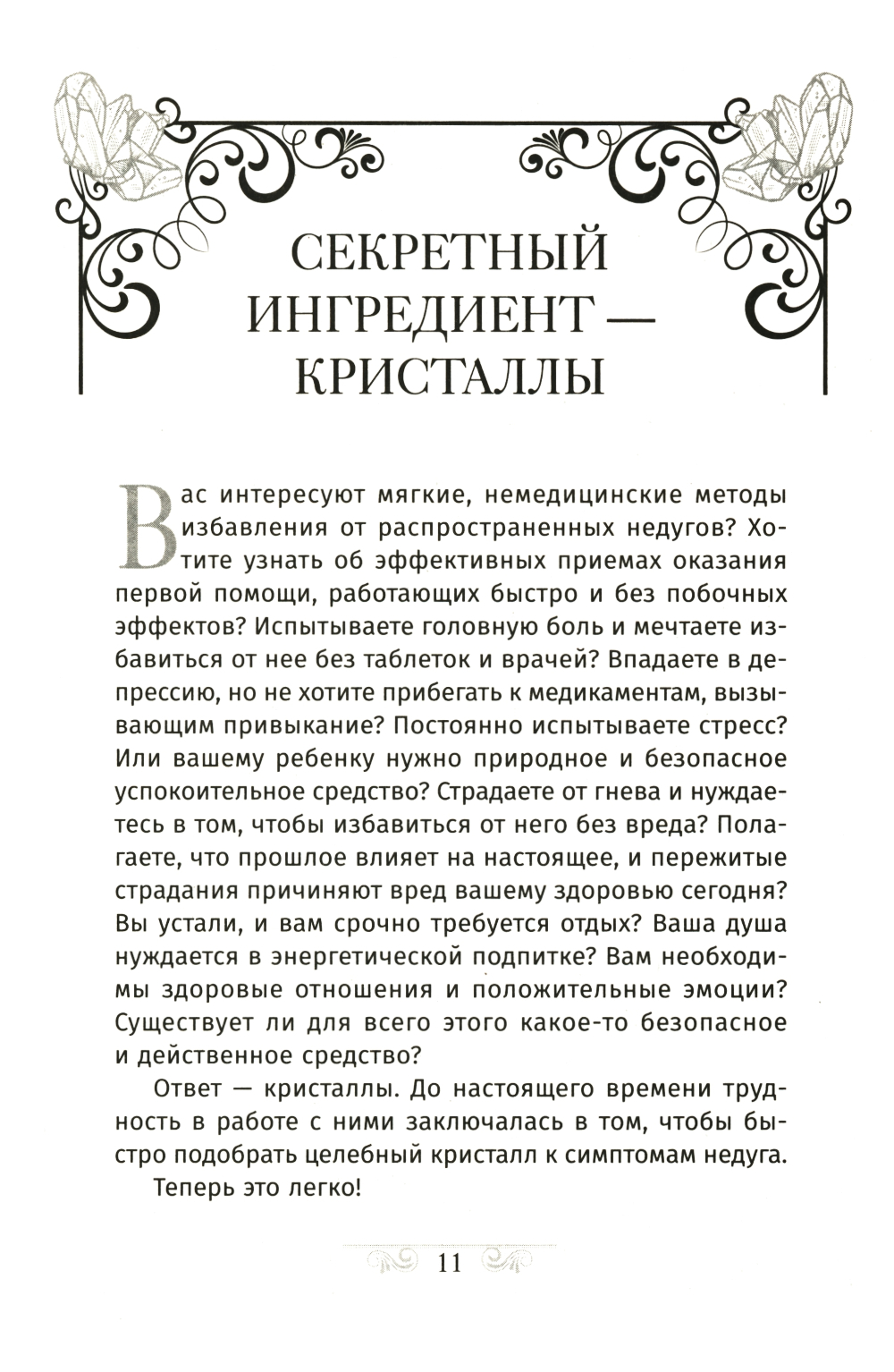 В книге вы найдете подробные рекомендации о том, как: подбирать кристаллы к различным симптомам заболеваний; активировать, заряжать, чистить и хранить камни; готовить целебные настойки на основе минералов; прикладывать кристаллы к больным органам и чакрам, а также размещать в комнате, чтобы усилить их целительное воздействие.