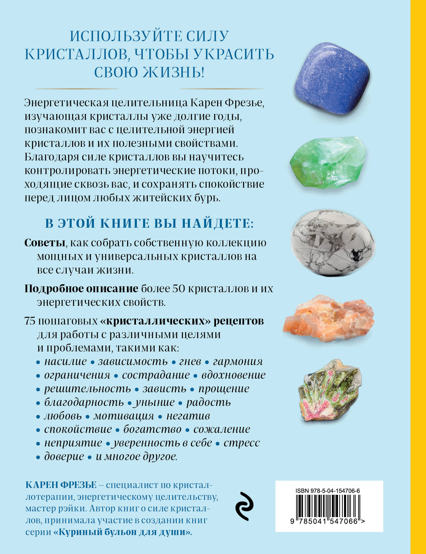 Используйте силу кристаллов, чтобы украсить свою жизнь! Даже если вы никогда не работали с кристаллами, эта книга поможет вам разобраться в многообразном и загадочном мире кристаллов. Энергетическая целительница Карен Фрезье, изучающая кристаллы уже долгие годы, познакомит вас с целительной энергией кристаллов и их полезными свойствами. Благодаря силе кристаллов вы научитесь контролировать энергетические потоки, проходящие сквозь вас, и сохранять спокойствие перед лицом любых житейских бурь. В этой книге вы найдете: • Советы, как собрать собственную коллекцию мощных и универсальных кристаллов на все случаи жизни. • Подробное описание более 50 кристаллов и их энергетических свойств, а также изображения камней как в обработанном, так и в природном виде, благодаря которым вы легко научитесь отличать кристаллы друг от друга. • 75 пошаговых «кристаллических» рецептов для избавления от негативных эмоций и привлечения позитивных изменений. Карен Фрезье - специалист по кристаллотерапии, энергетическому целительству, мастер рэйки. Автор книг о целительной силе кристаллов, принимала участие в создании книг серии «Куриный бульон для души».| Издательство | ООО "Издательство "Эксмо" |