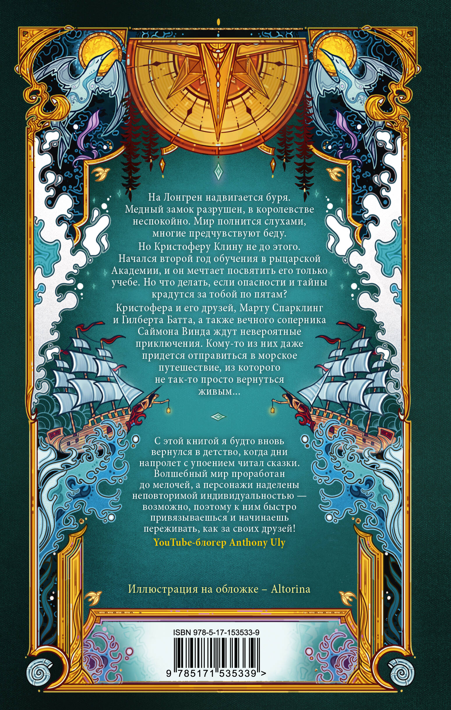 На Лонгрен надвигается буря. Медный замок разрушен, в королевстве неспокойно. Мир полнится слухами, многие предчувствуют беду. Но Кристоферу Клину не до этого. Начался второй год обучения в рыцарской Академии, и он мечтает посвятить его только учебе. Но что делать, если опасности и тайны крадутся за тобой по пятам? Кристофера и его друзей, Марту Спарклинг и Гилберта Батта, а также вечного соперника Саймона Винда ждут невероятные приключения. Кому-то из них даже придется отправиться в морское путешествие, из которого не так-то просто вернуться живым... С этой книгой я будто вновь вернулся в детство, когда дни напролет с упоением читал сказки. Волшебный мир проработан до мелочей, а персонажи наделены неповторимой индивидуальностью - возможно, поэтому к ним быстро привыкаешь и начинаешь переживать, как за своих друзей. YouTube-блогер Anthony Uly| Издательство | ИЗДАТЕЛЬСТВО "АСТ" |