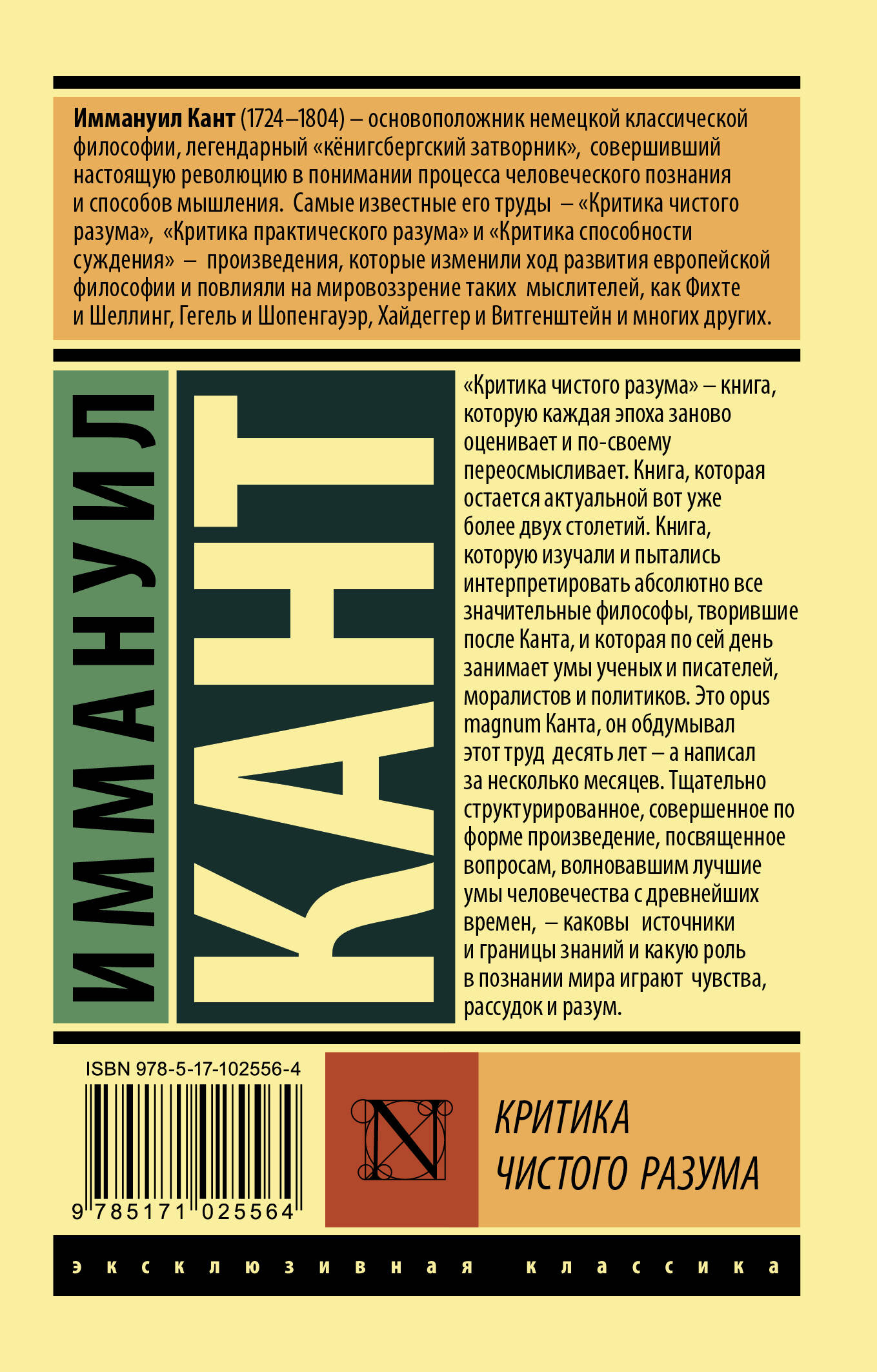 "Критика чистого разума" - книга, которую каждая эпоха заново оценивает и по-своему переосмысливает. Книга, которая остается актуальной вот уже более двух столетий. Книга, которую изучали и пытались интерпретировать абсолютно все значительные философы, творившие после Канта, и которая по сей день занимает умы ученых и писателей, моралистов и политиков. Это opus magnum Канта, он обдумывал этот труд десять лет - а написал за несколько месяцев. Тщательно структурированное, совершенное по форме произведение, посвященное вопросам, волновавшим лучшие умы человечества с древнейших времен, - каковы источники и границы знаний и какую роль в познании мира играют чувства, рассудок и разум.| Издательство | ИЗДАТЕЛЬСТВО "АСТ" |