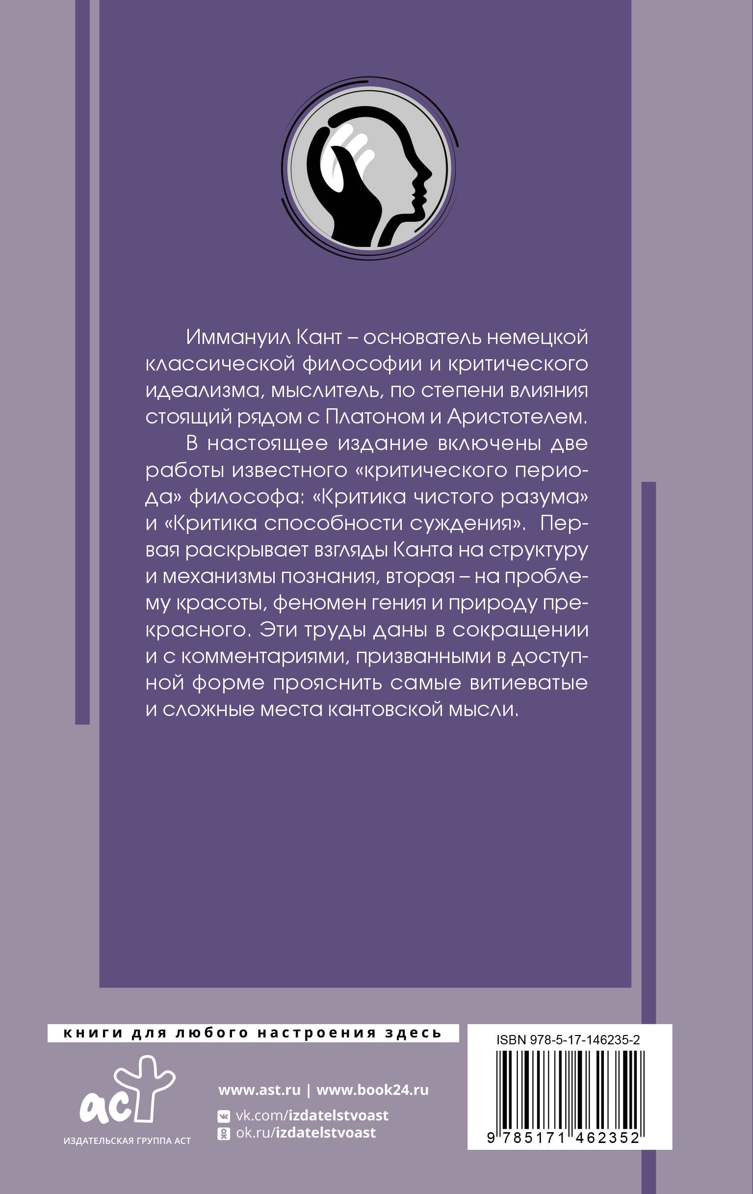 Труды одного из самых популярных философов не только прошлых столетий, но и современности! Иммануил Кант - основатель немецкой классической философии и критического идеализма, мыслитель, по степени влияния стоящий рядом с Платоном и Аристотелем. В настоящее издание включены две работы известного «критического периода» философа: «Критика чистого разума» и «Критика способности суждения». Первая раскрывает взгляды Канта на структуру и механизмы познания, вторая - на проблему красоты, феномен гения и природу прекрасного. Эти труды даны в сокращении и с комментариями, призванными в доступной форме прояснить самые витиеватые и сложные места кантовской мысли.