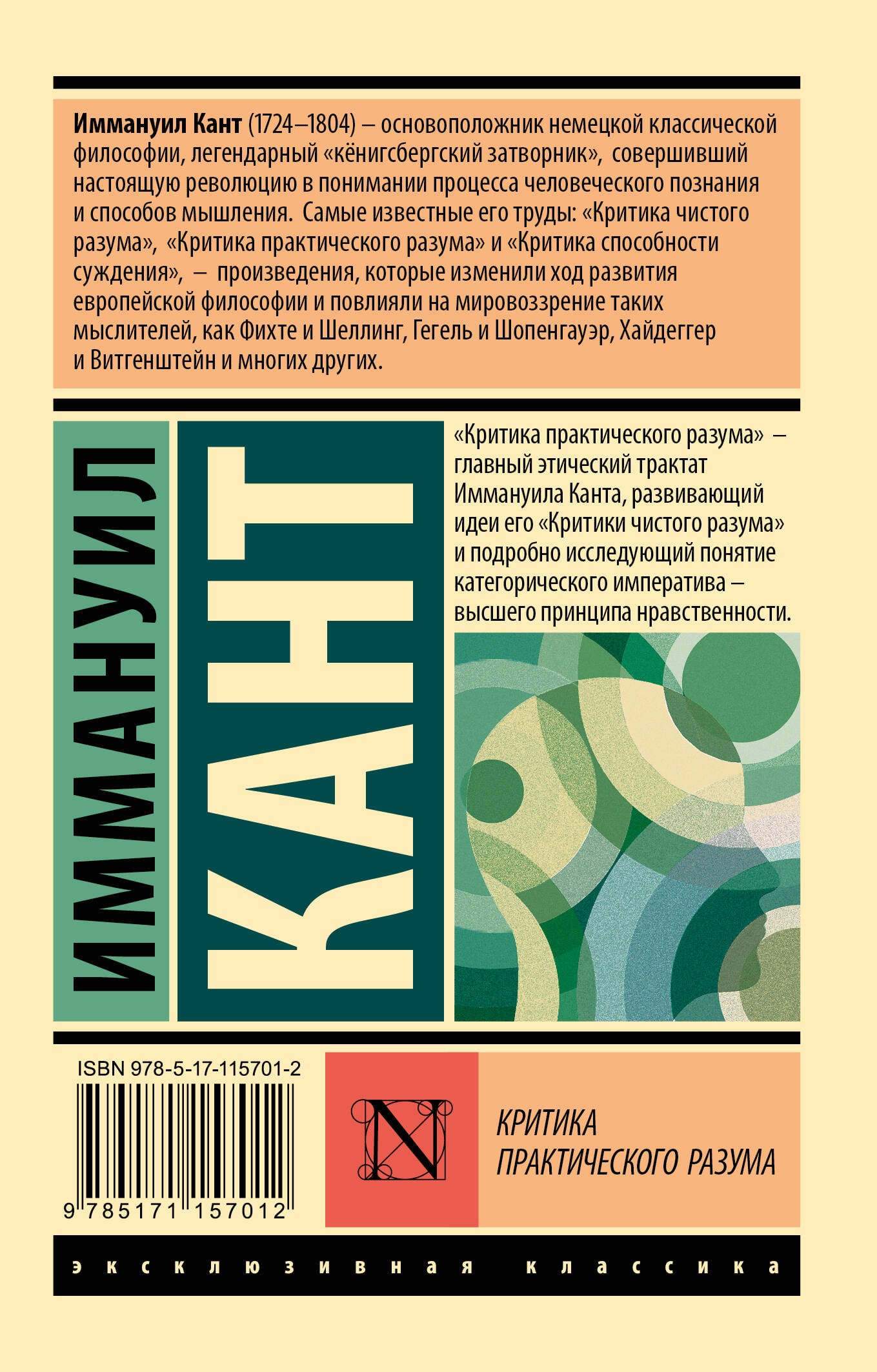Иммануил Кант - величайший философ Западной Европы, один из ведущих мыслителей эпохи Просвещения, родоначальник немецкой классической философии, основатель критического идеализма, внесший решающий вклад в развитие европейской философской традиции. "Критика практического разума" - главный этический трактат Иммануила Канта, развивающий идеи его "Критики чистого разума" и подробно исследующий понятие категорического императива - высшего принципа нравственности.| Издательство | ИЗДАТЕЛЬСТВО "АСТ" |
