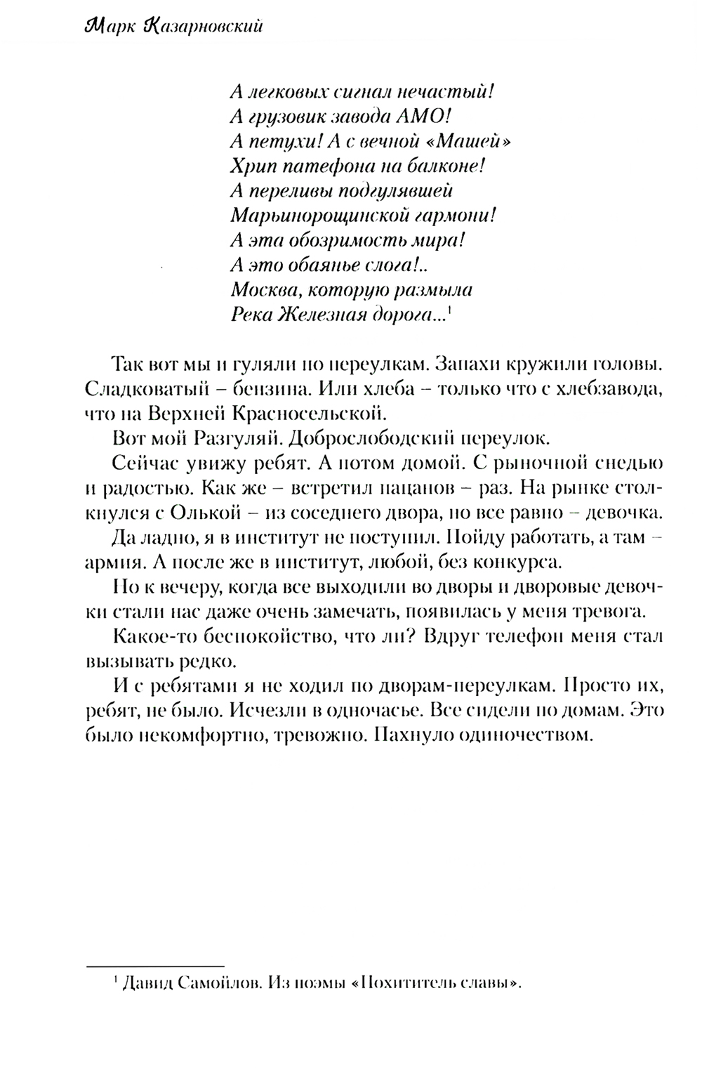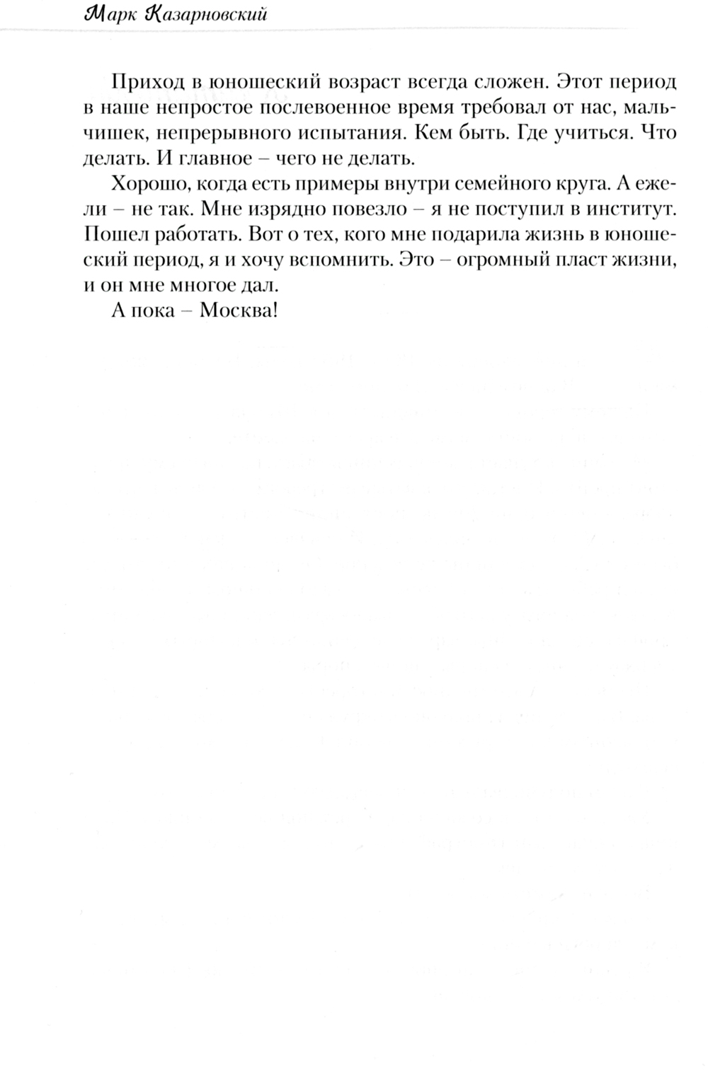 Новая книга Марка Казарновского «Кривоколенный переулок, или Моя счастливая юность» является продолжением его повести «Мое счастливое детство». Автор рассказывает о периоде взросления героя, его взаимоотношениях с ранее незнакомым ему миром людей нелегкой cyдьбы, прошедших войну и оказавших большое влияние на формирование его характера. Общение с ними подготовило героя книги к вступлению в реальную жизнь.| Издательство | ИПО "У Никитских ворот" |