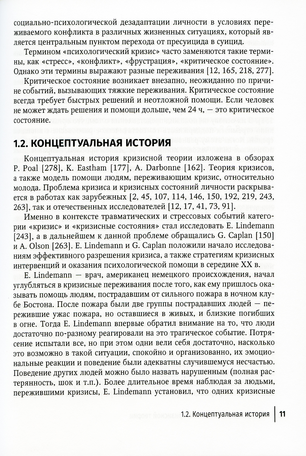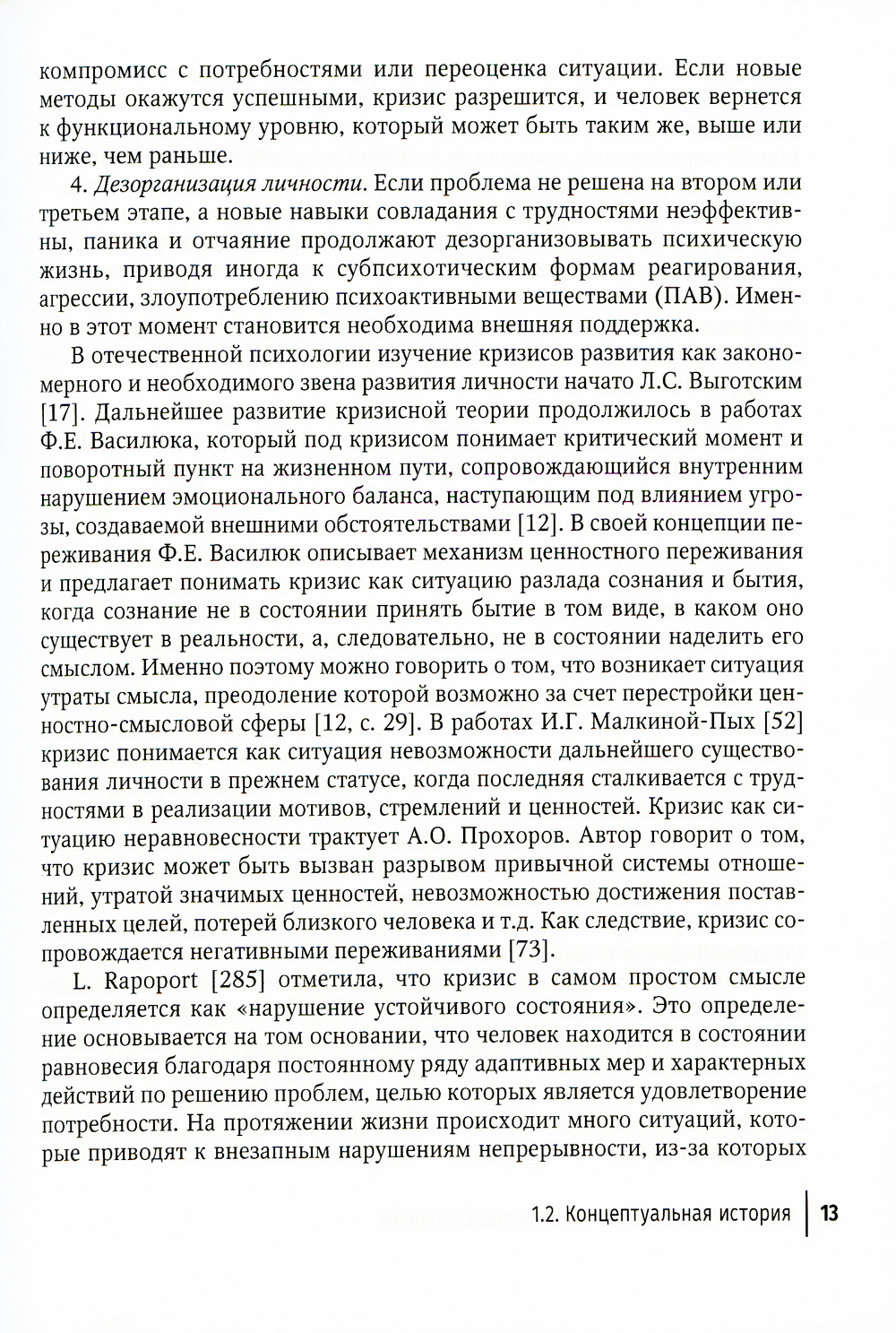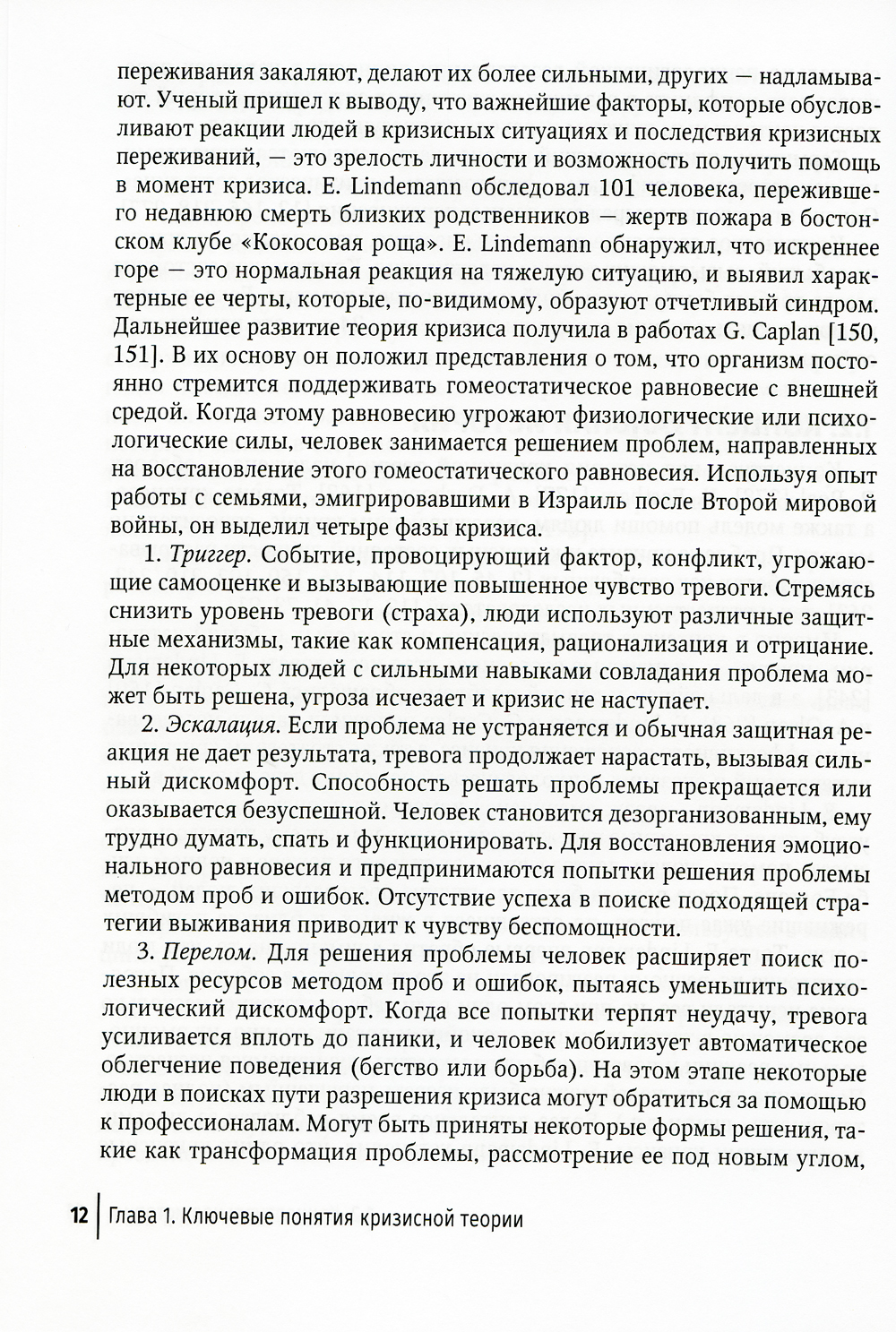 В руководстве приведены актуальные подробные сведения о психологическом кризисе человека и кризисных расстройствах, современные теоретические представления о механизмах кризиса личности, стресса и его последствий для здоровья. Акцент сделан на клинических формах кризисных состояний, описанных в соответствии с современными международными классификациями. Даны старые и новые представления об острых реакциях на стресс, посттравматическом стрессовом расстройстве, реакциях адаптации, состояниях острого и длительного горя. Отдельная глава посвящена методам преодоления кризиса и принципам организации кризисной помощи. В приложениях содержатся наиболее распространенные психологические методики. Издание предназначено психиатрам, психотерапевтам, клиническим психологам и может быть полезно ординаторам, обучающимся по специальности «Психиатрия».| Издательство | ГЭОТАР-Медиа |