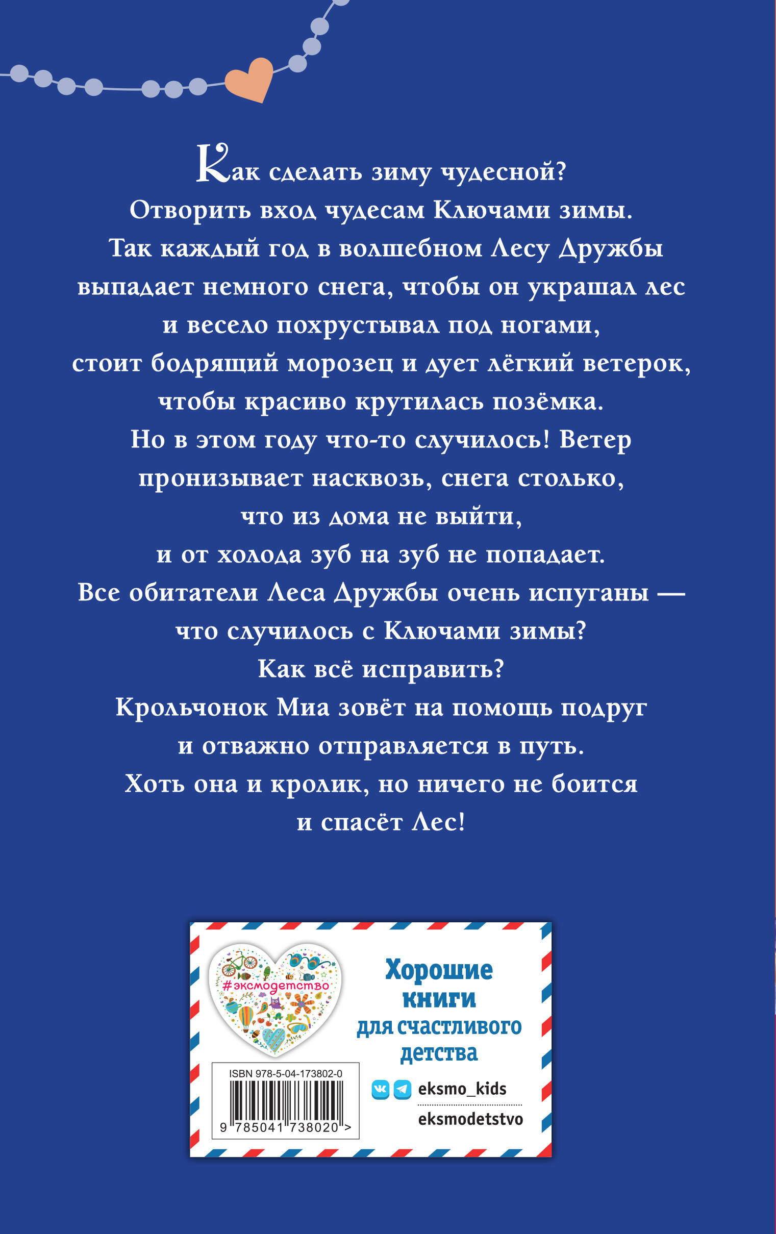 Снежный праздник под угрозой! Злая ведьма Гризельда украла и спрятала чудесные Ключи зимы. В волшебном Лесу Дружбы стало очень холодно и никак не прекращается снегопад, сугробы уже выше кустов! Надо что-то делать. Крольчонок Миа зовёт подруг на помощь, берёт лыжи и санки и отправляется на поиски. Она спасёт праздник! Книга для тех, кто мечтает оказаться в волшебной стране, где живут говорящие животные, с которыми можно дружить и пускаться в приключения! Дейзи Медоус - автор более ста книг для детей, среди которых серия Rainbow Magic - всемирный бестселлер о приключениях фей! Крупный шрифт, красивые чёрно-белые иллюстрации, увлекательная история понравятся тем детям, которые уже любят читать, и тем, у которых навыки чтения ещё не закрепились.| Издательство | ООО "Издательство "Эксмо" |