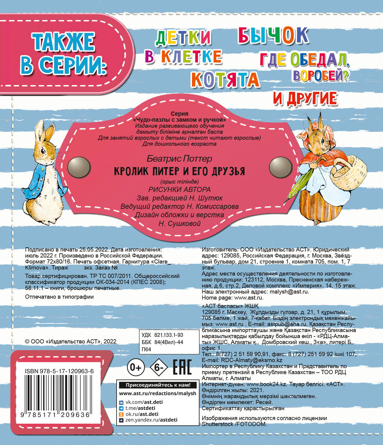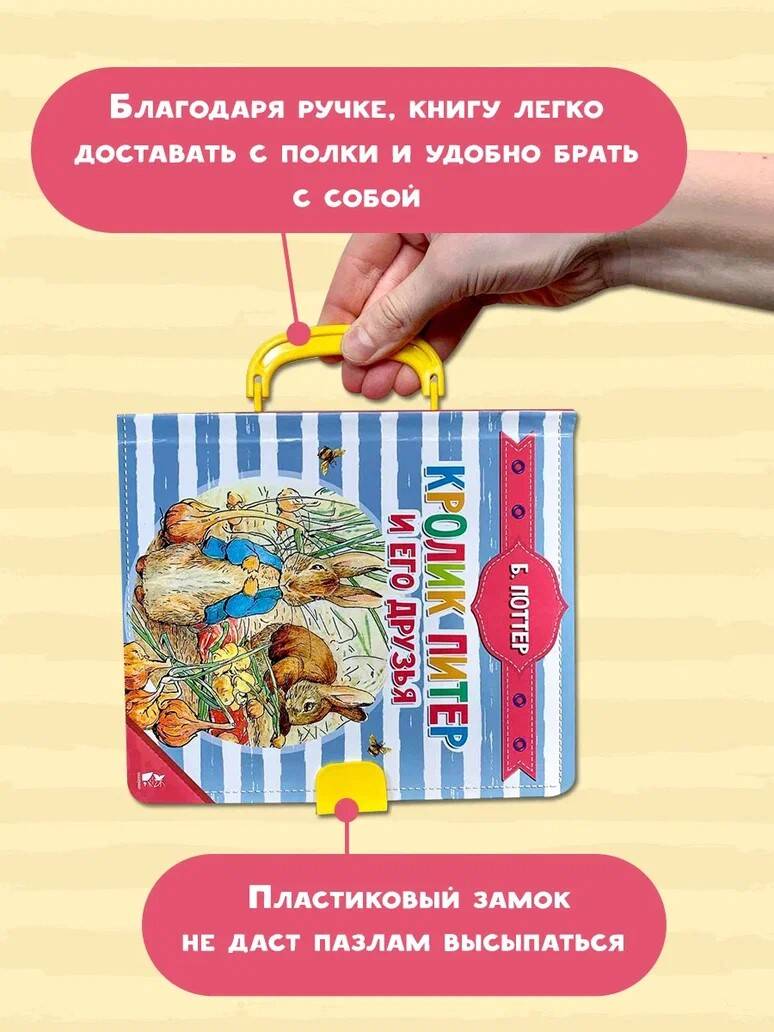 Кролик Питер - любимый герой миллионов малышей. Познакомьте своего кроху с классикой мировой литературы! Вас ждет удивительная история о Питере в необычном формате! Ваш малыш будет с удовольствием рассматривать непревзойденные иллюстрация автора. А главное, на каждом из шести разворотов его ждет красочный пазл из 6 прочных деталей. Пока взрослые читают вслух трогательную поучительную сказку о дружбе, малыш будет развивать мелкую моторику, концентрацию внимания и усидчивость. Удобная ручка и пластиковый замочек, прикрепленные к книге, позволят взять ее с собой в дорогу, на прогулку или в гости. Читайте любимые сказки и играйте с пользой! Книги серии «Чудо-пазлы с замком и ручкой» - классика для самых маленьких в удобном игровом формате! • Любимые классические стихи и сказки для самых маленьких • Иллюстрации лучших детских художников • Книги, на которых выросло не одно поколение и которые должен прочесть каждый образованный малыш • Крупные развивающие пазлы из плотного картона с выемкой для маленьких пальчиков - на каждом развороте • Прочный пластиковый замочек и ручка - удобно брать с собой в дорогу • Плотная толстенькая обложка с поролоном • Идеальный подарок малышу! • От 6 месяцев и старше| Издательство | АСТ |