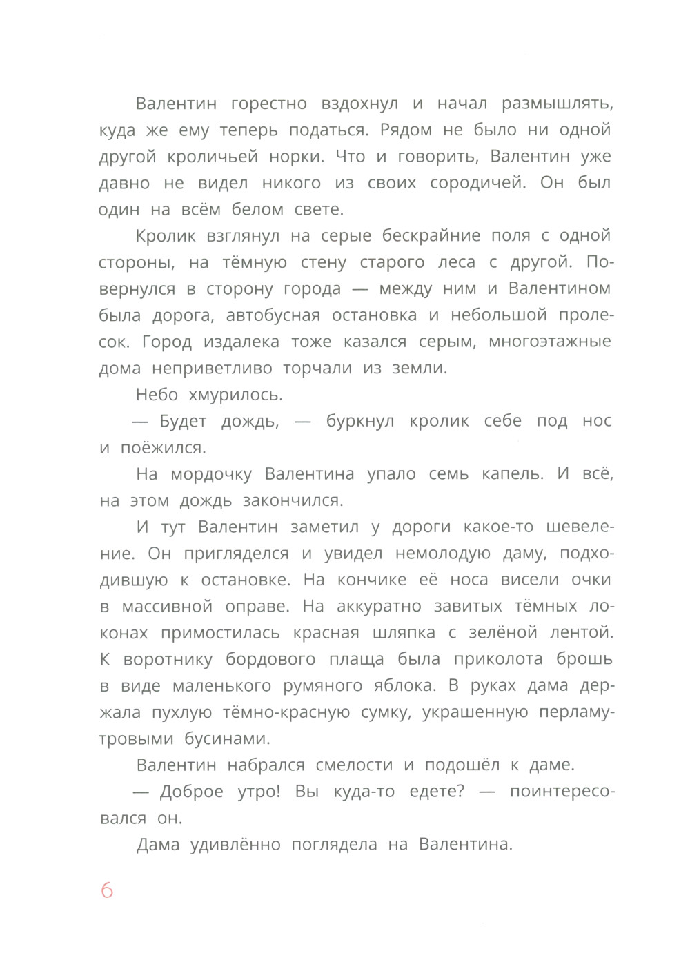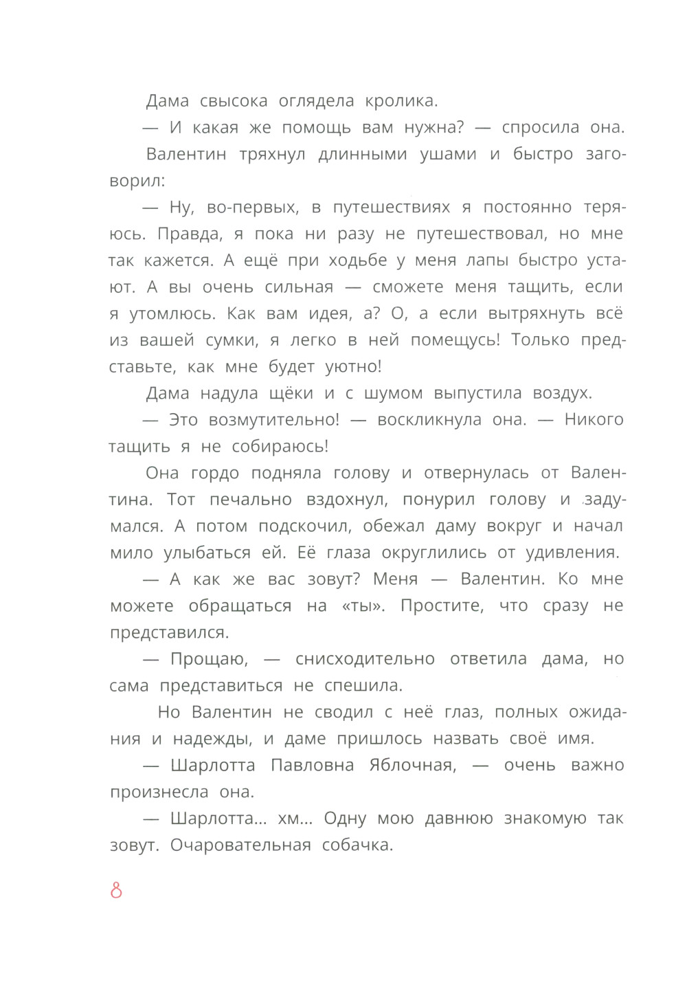 Добрый и обаятельный, но плохо воспитанный кролик по имени Валентин живёт один-одинёшенек в своём обветшалом домике-норке. Валентину хочется увидеть мир, найти настоящего друга, с которым можно разделить все горести и радости, а ещё он втайне мечтает исправить свой непростой характер. Твёрдо решив изменить жизнь к лучшему, кролик отправляется на ближайшую автобусную остановку, где и встречает Шарлотту Павловну Яблочную. О, Шарлотта Павловна - весьма необычная пожилая дама! Интересно, куда она держит путь? Никто не поверил бы, услышав, какое удивительнейшее путешествие ждёт их с Валентином впереди...| Издательство | Детская литература |