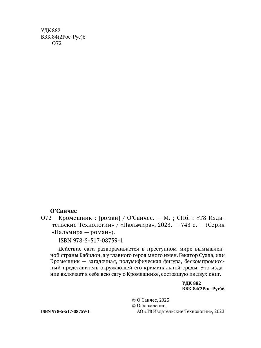 Действие саги разворачивается в преступном мире вымышленной страны Бабилон, а у главного героя много имен. Гекатор Сулла, или Кромешник - загадочная, полумифическая фигура, бескомпромиссный представитель окружающей его криминальной среды. Это издание включает в себя всю сагу о Кромешнике, состоящую из двух книг.| Издательство | Т8 RUGRAM |