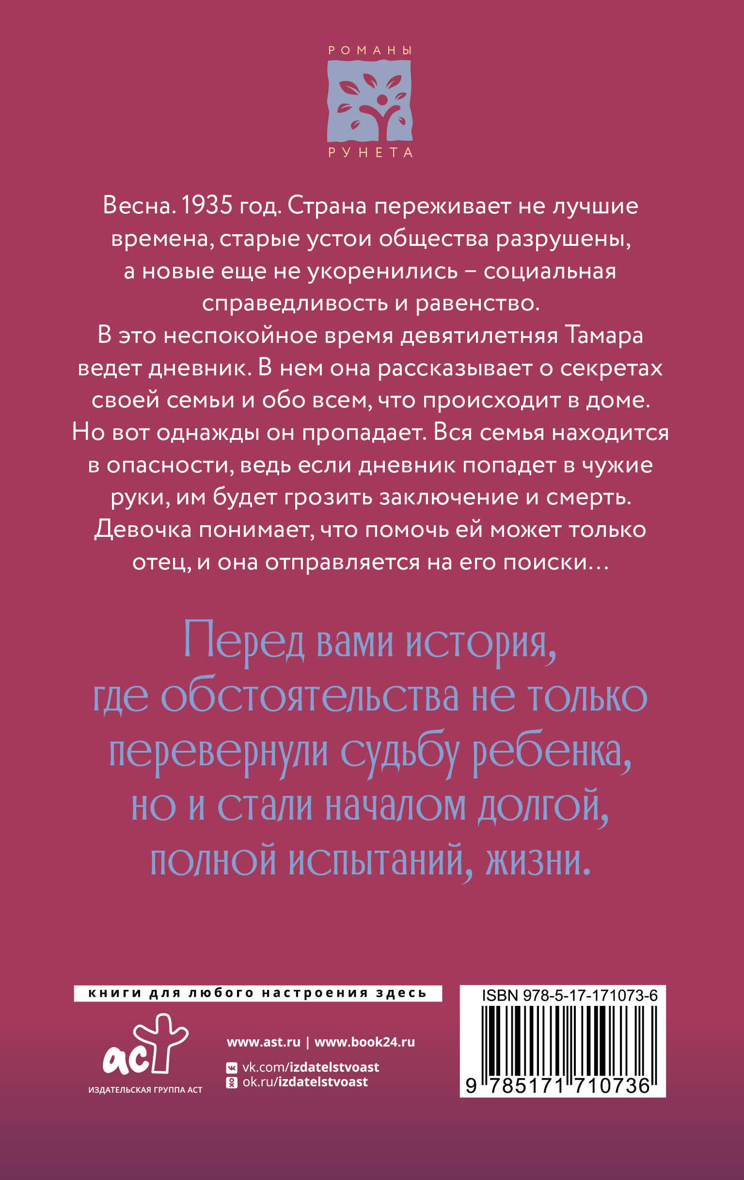 Весна. 1935 год. Страна переживает не лучшие времена, старые устои общества разрушены, а новые еще не укоренились - социальная справедливость и равенство. В это неспокойное время девятилетняя Тамара ведет дневник. В нем она рассказывает о секретах своей семьи и обо всем, что происходит в доме. Но вот однажды он пропадает. Вся семья находится в опасности, ведь если дневник попадет в чужие руки, им будет грозить заключение и смерть. Девочка понимает, что помочь ей может только отец, и она отправляется на его поиски… Перед вами история, где обстоятельства не только переверну ли судьбу ребенка, но и стали началом долгой, полной испытаний жизни.| Издательство | Издательство "АСТ" |