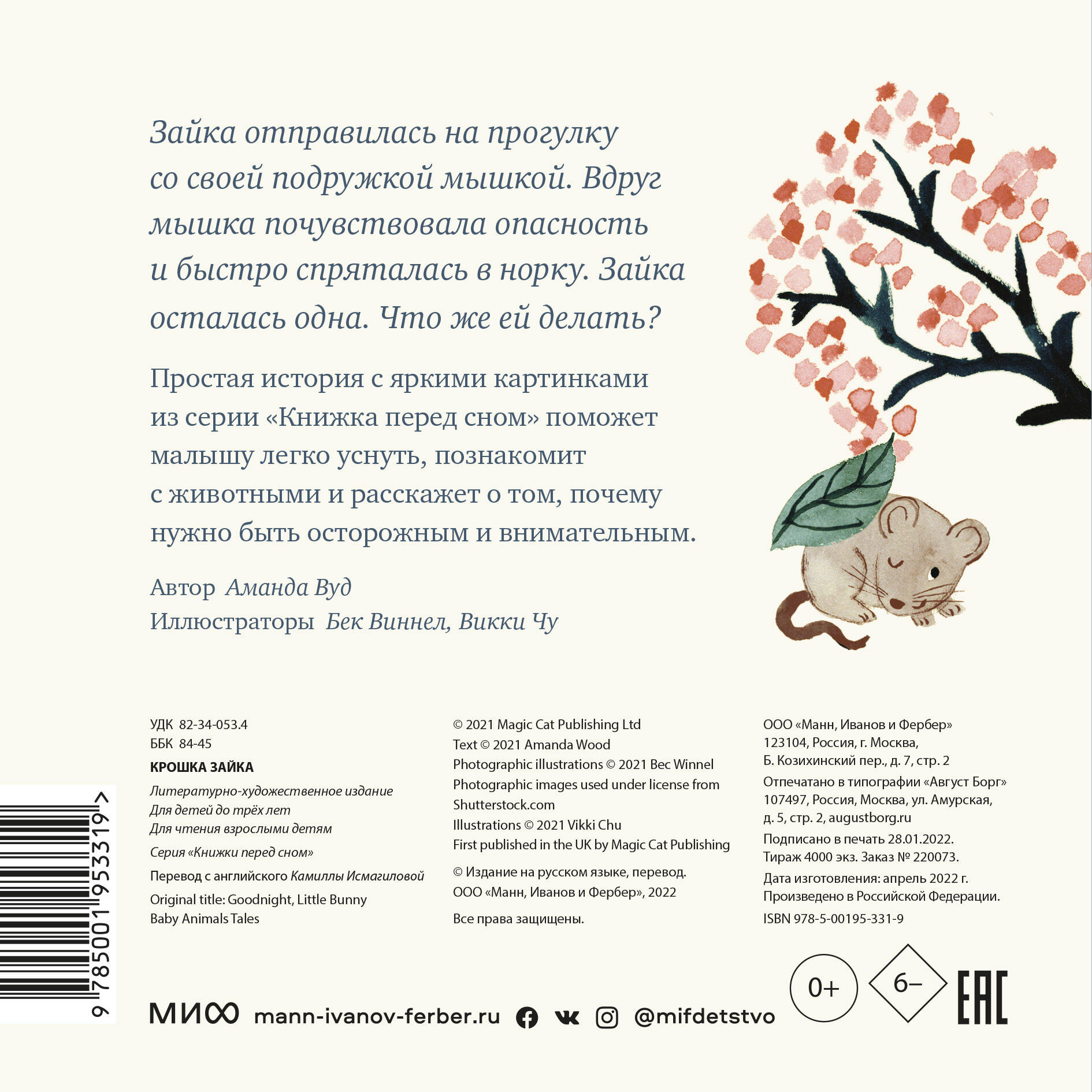 Ваш малыш никак не хочет ложиться спать? Почитайте ему перед сном трогательную историю про Зайку, и укладывание пройдет легче и эффективнее. Маленькая Зайка отправилась на прогулку со своей подружкой мышкой. Но вдруг мышка юркнула в норку и пропала. Зайка решила узнать почему, и столкнулась с опасностью. Что она будет делать? История про умную Зайку наверняка понравится вашему малышу, а процесс чтения успокоит его после активных игр и поможет легко заснуть. В мире продано 300 тысяч экземпляров книги. О серии: Порой, чтобы уложить ребёнка спать, надо потратить немало усилий. И даже если цель была достигнута, мама часто чувствует опустошенность и усталость. Упростить процесс укладывания может какой-то приятный ритуал перед сном: одно и то же действие, которое вы всегда совершаете с малышом перед тем, как отправиться в кровать. Такие ритуалы формируют у детей привычку на засыпание, и процесс укладывания становится приятным. Какой же ритуал выбрать? Конечно же, чтение! Серия книг для малышей "Книжка перед сном" создана именно для этого. Короткие истории с одним ярким сюжетом и запоминающимся героем, который в конце непременно уснёт, обязательно увлекут ребёнка. Кроме того, малыш столкнётся с простыми жизненными ситуациями, которые вы с ним сможете обсудить. Но и это ещё не всё! Книги отлично подходят для того, чтобы познакомиться с животными. В этих небольших картонных книжках содержится очень много пользы. Для кого эта книга: Для самых маленьких. Для детей от 2 лет.| Издательство | Манн, Иванов и Фербер |