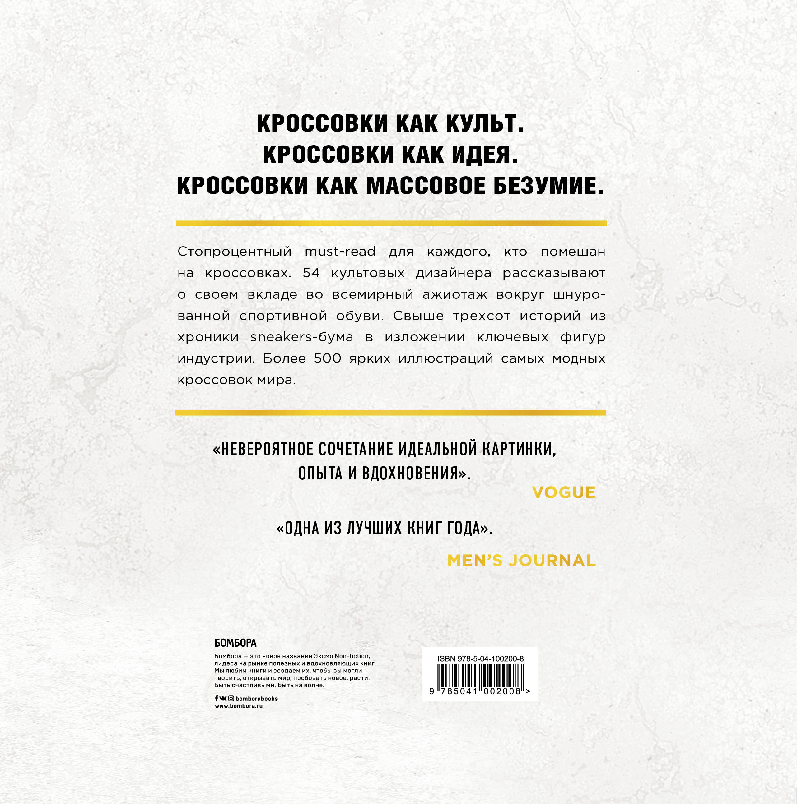 Кроссовки как культ. Кроссовки как идея. Кроссовки как массовое безумие. Стопроцентный must-rеad для каждого, кто помешан на кроссовках. 54 культовых дизайнера рассказывают о своем вкладе во всемирный ажиотаж вокруг шнурованной спортивной обуви. Более трехсот историй из хроники sneakers-бума в изложении ключевых фигур индустрии. Более 500 ярких иллюстраций самых модных кроссовок мира.| Издательство | ООО "Издательство "Эксмо" |