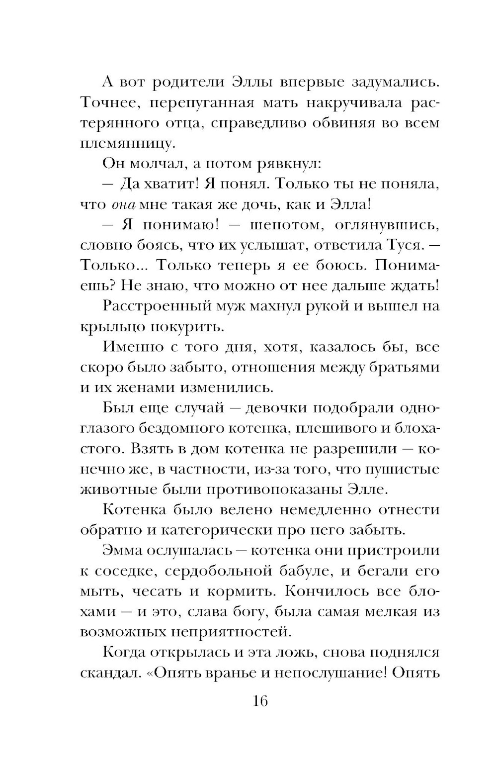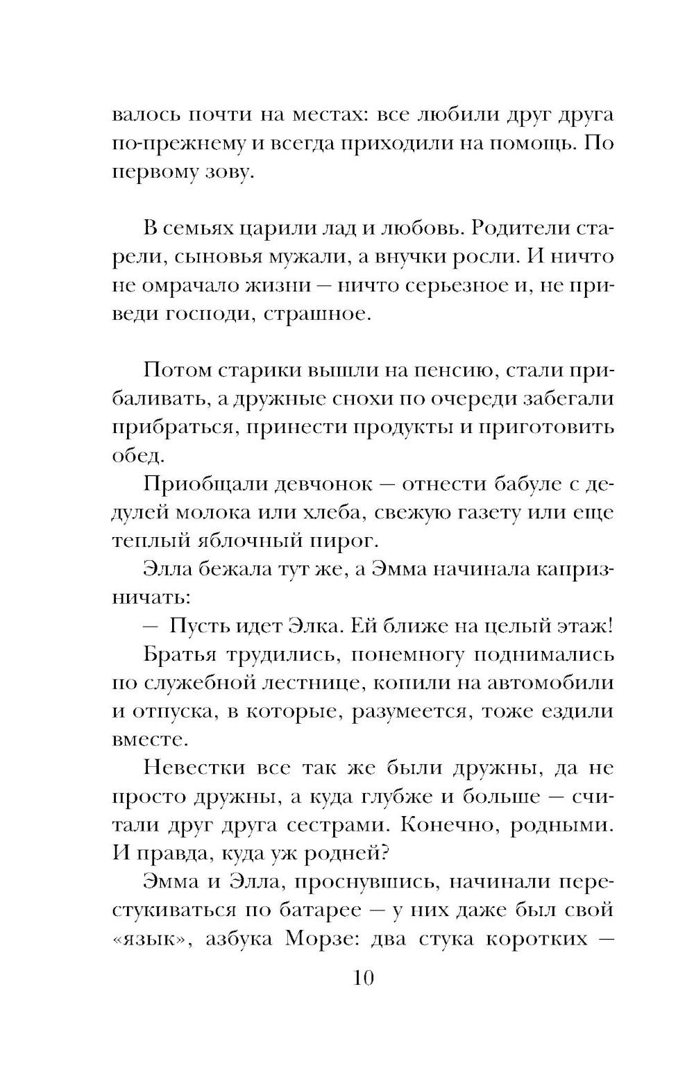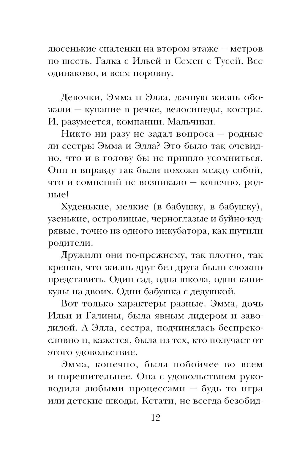 До какого предела можно идти на жертвы ради близких? Как, живя ради других, не потерять себя? Или жертвенность на то и жертвенность, чтобы отдавать без остатка? Вопросы эти каждый решает для себя. Для Эллы такой вопрос и не стоял - она, кажется, родилась для того, чтобы служить близким. А вот Эмма, ее сестра, всегда считала, что никому ничего не должна. Жила взахлеб, не оглядываясь, всегда зная, что есть Элла - безответная, верная, покорная. На которую можно положиться, которая всегда подставит плечо. И кто в итоге счастлив? Тот, кто брал или тот, кто отдавал? Тот, кому есть что вспомнить, или тот, кто в жизни так ничего и не увидел? Неужели чистая совесть и верность родственным узам стоят жизни, которой, по сути, и не было?| Издательство | Эксмо |
