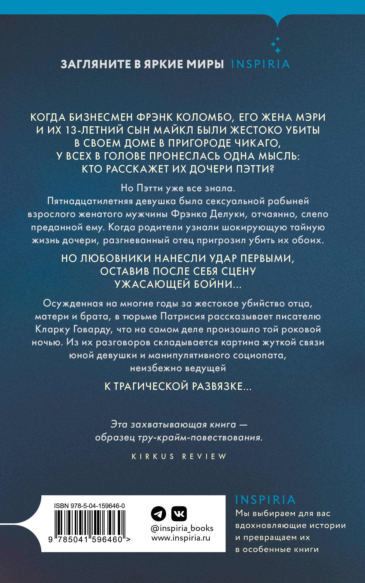 ШОКИРУЮЩАЯ РЕАЛЬНАЯ ИСТОРИЯ 15-ЛЕТНЕЙ ДЕВУШКИ, ГОТОВОЙ УБИТЬ ВСЮ СВОЮ СЕМЬЮ РАДИ МУЖЧИНЫ ВДВОЕ СТАРШЕ НЕЕ - ОТ КЛАССИКА АМЕРИКАНСКОЙ ТРУ-КРАЙМ ЛИТЕРАТУРЫ. Когда бизнесмен Фрэнк Коломбо, его жена Мэри и их 13-летний сын Майкл были жестоко убиты в своем доме в пригороде Чикаго, у всех в голове пронеслась одна мысль: кто расскажет их дочери Пэтти? Но Пэтти уже все знала. Пятнадцатилетняя девушка была сексуальной рабыней взрослого женатого мужчины Фрэнка Делуки, отчаянно, слепо преданной ему. Когда родители узнали шокирующую тайную жизнь дочери, разгневанный отец пригрозил убить их обоих. Но любовники нанесли удар первыми, оставив после себя сцену ужасающей бойни... Осужденная на многие годы за убийство отца, матери и брата, в тюрьме Патрисия рассказывает писателю Кларку Говарду о том, что привело их с Делукой к трагической развязке. Но, как и бывает там, где замешаны большие страсти, это не только история о семейных скелетах в шкафу и зависимости от манипулятивного социопата, но и история о ненадежном рассказчике - и Говарду самому предстоит анализировать улики и показания, чтобы докопаться до истины... ----------------------------- «Эта глубоко захватывающая история о подростке, который, возможно, помог убить своих родителей, является образцом беспристрастного тру-крайм повествования». - Kirkus Reviews «Захватывающее повествование и загадочная Патрисия Коломбо приклеят читателей к страницам. Эта интригующая книга настоятельно рекомендуется для всех любителей реальных криминальных историй». - Library Journal| Издательство | ООО "Издательство "Эксмо" |