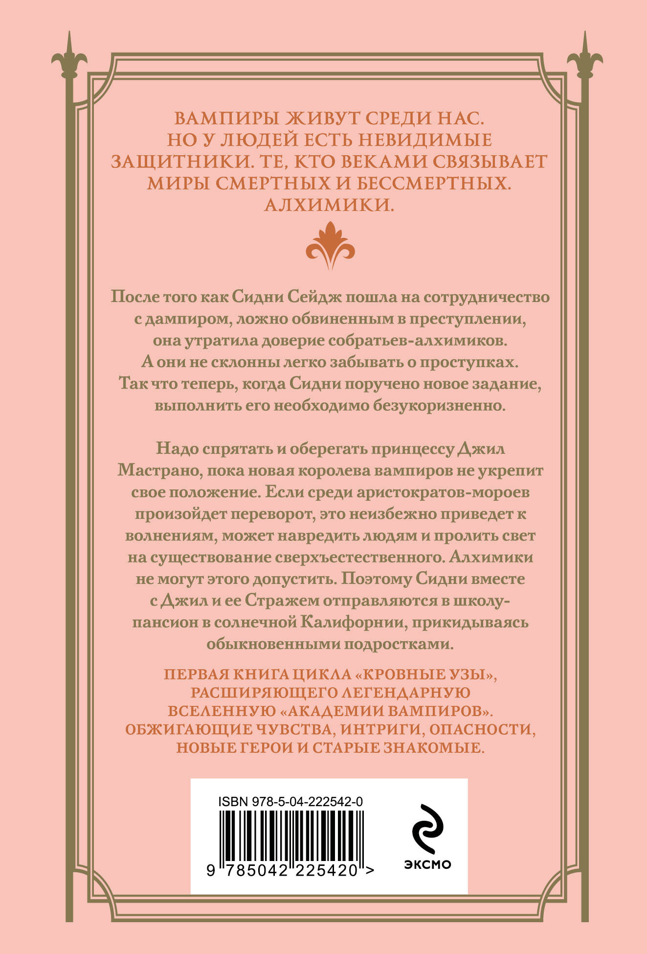 Сидни Сейдж принадлежит к семье алхимиков, а значит, с самого детства готовилась к тому, чтобы защищать смертных от вампиров. «Защищать» - значит и хранить в тайне само существование кровопийц. Но когда политическая ситуация среди вампиров-аристократов мороев становится шаткой, этот секрет оказывается под угрозой. И Сидни поручают новое задание, несмотря на то, что она почти утратила доверие соратников. Это, возможно, ее последний шанс проявить себя. Ей нужно сопровождать и защищать принцессу мороев. Первая книга цикла «Кровные узы», расширяющего легендарную вселенную «Академии вампиров», в удобном формате классического покета.| Издательство | ООО "Издательство "Эксмо" |