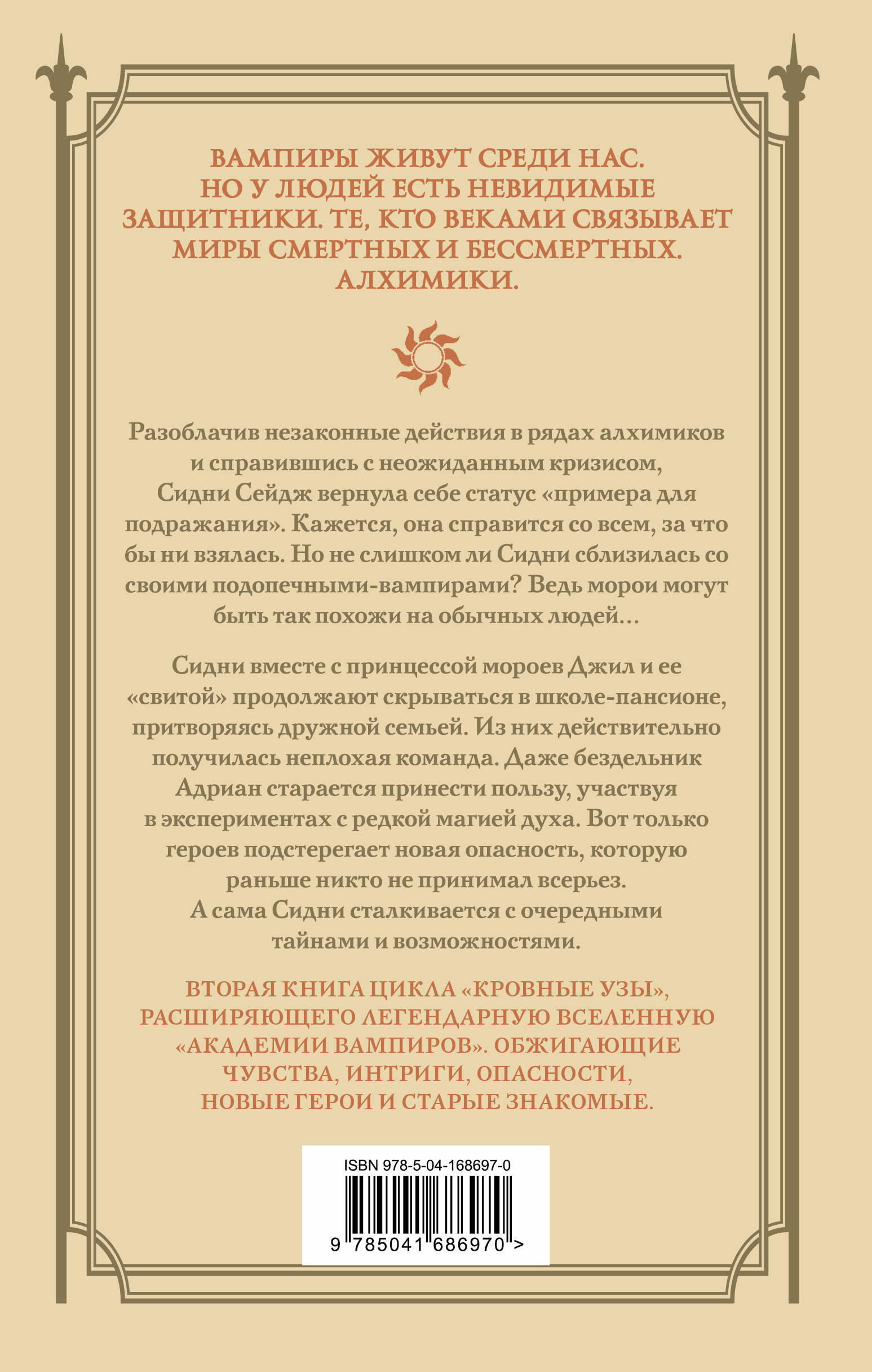 Продолжение цикла «Кровные узы», расширяющего легендарную вселенную «Академии вампиров». Оригинальная история, которую можно читать как самостоятельный цикл, а действующими лицами становятся не только вампиры и дампиры, но и алхимики - люди, которые пойдут на все, чтобы существование сверхъестественного оставалось в тайне. Сидни Сейдж - одна из них. Сидни сумела вернуть себе доверие собратьев-алхимиков, но надолго ли? Один неверный шаг, и ее могут заподозрить в том, что она слишком сблизилась со своими «подопечными» вампирами. Ведь они действительно прекрасно поладили. И это неестественно. Нельзя расслабляться рядом с ними, нельзя обмануться тем, что у них тоже есть чувства и свои слабости. Ей приходится балансировать на тонкой грани между долгом и тем, что кажется правильным здесь и сейчас. Вместе Сидни, морои и дампиры проводят эксперименты с редкой и загадочной магией духа, и даже бездельник Адриан пытается взять себя в руки. Но вскоре всем героям придется признать, что в этом мире, где вампиры реальны, могут ожить и другие мифы. Больше магии, тайн и опасностей!| Издательство | ООО "Издательство "Эксмо" |