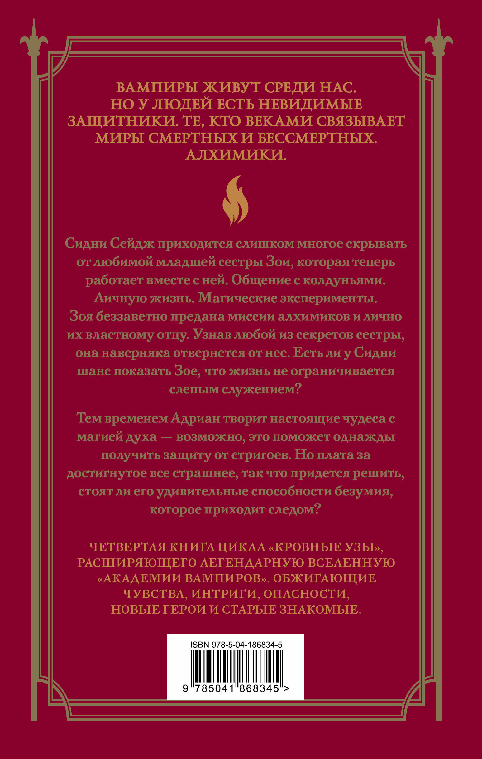 Сидни Сейдж приходится слишком многое скрывать от любимой младшей сестры Зои, которая теперь работает вместе с ней. Общение с колдуньями. Личную жизнь. Магические эксперименты. Зоя беззаветно предана миссии алхимиков и лично их властному отцу. Узнав любой из секретов сестры, она наверняка отвернется от нее. Есть ли у Сидни шанс показать Зое, что жизнь не ограничивается слепым служением? Тем временем Адриан творит настоящие чудеса с магией духа - возможно, это поможет однажды получить защиту от стригоев. Но плата за достигнутое все страшнее, так что придется решить, стоят ли его удивительные способности безумия, которое приходит следом? Переиздание четвертой книги цикла «Кровные узы», который расширяет популярную вселенную «Академии вампиров».| Издательство | ООО "Издательство "Эксмо" |