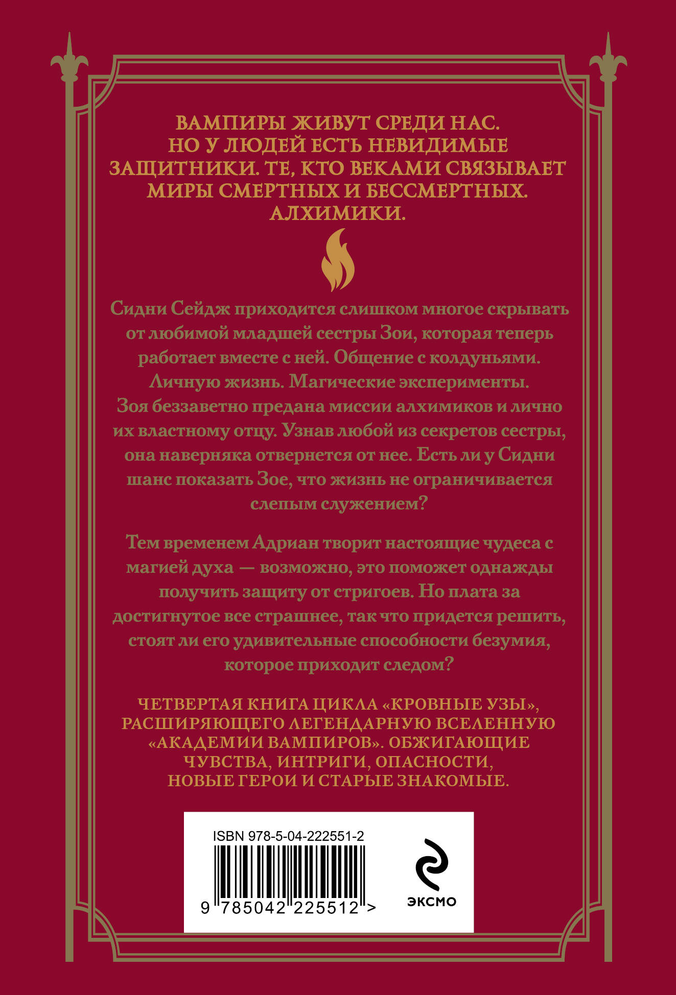 Сидни Сейдж приходится слишком многое скрывать от любимой младшей сестры Зои, которая теперь работает вместе с ней. Общение с колдуньями. Личную жизнь. Магические эксперименты. Зоя беззаветно предана миссии алхимиков и лично их властному отцу. Узнав любой из секретов сестры, она наверняка отвернется от нее. Есть ли у Сидни шанс показать Зое, что жизнь не ограничивается слепым служением? Тем временем Адриан творит настоящие чудеса с магией духа - возможно, это поможет однажды получить защиту от стригоев. Но плата за достигнутое все страшнее, так что придется решить, стоят ли его удивительные способности безумия, которое приходит следом? Четвертая книга цикла «Кровные узы», расширяющего легендарную вселенную «Академии вампиров», в удобном формате классического покета.| Издательство | ООО "Издательство "Эксмо" |
