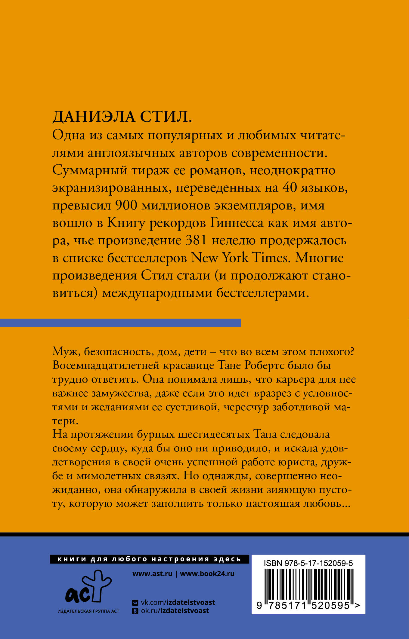 Муж, безопасность, дом, дети - что во всем этом плохого? Восемнадцатилетней красавице Тане Робертс было бы трудно ответить. Она понимала лишь, что карьера для нее важнее замужества, даже если это идет вразрез с условностями и желаниями ее суетливой, чересчур заботливой матери. На протяжении бурных шестидесятых Тана следовала своему сердцу, куда бы оно ни приводило, и искала удовлетворения в своей очень успешной работе юриста, дружбе и мимолетных связях. Но однажды, совершенно неожиданно, она обнаружила в своей жизни зияющую пустоту, которую может заполнить только настоящая любовь...| Издательство | ИЗДАТЕЛЬСТВО "АСТ" |