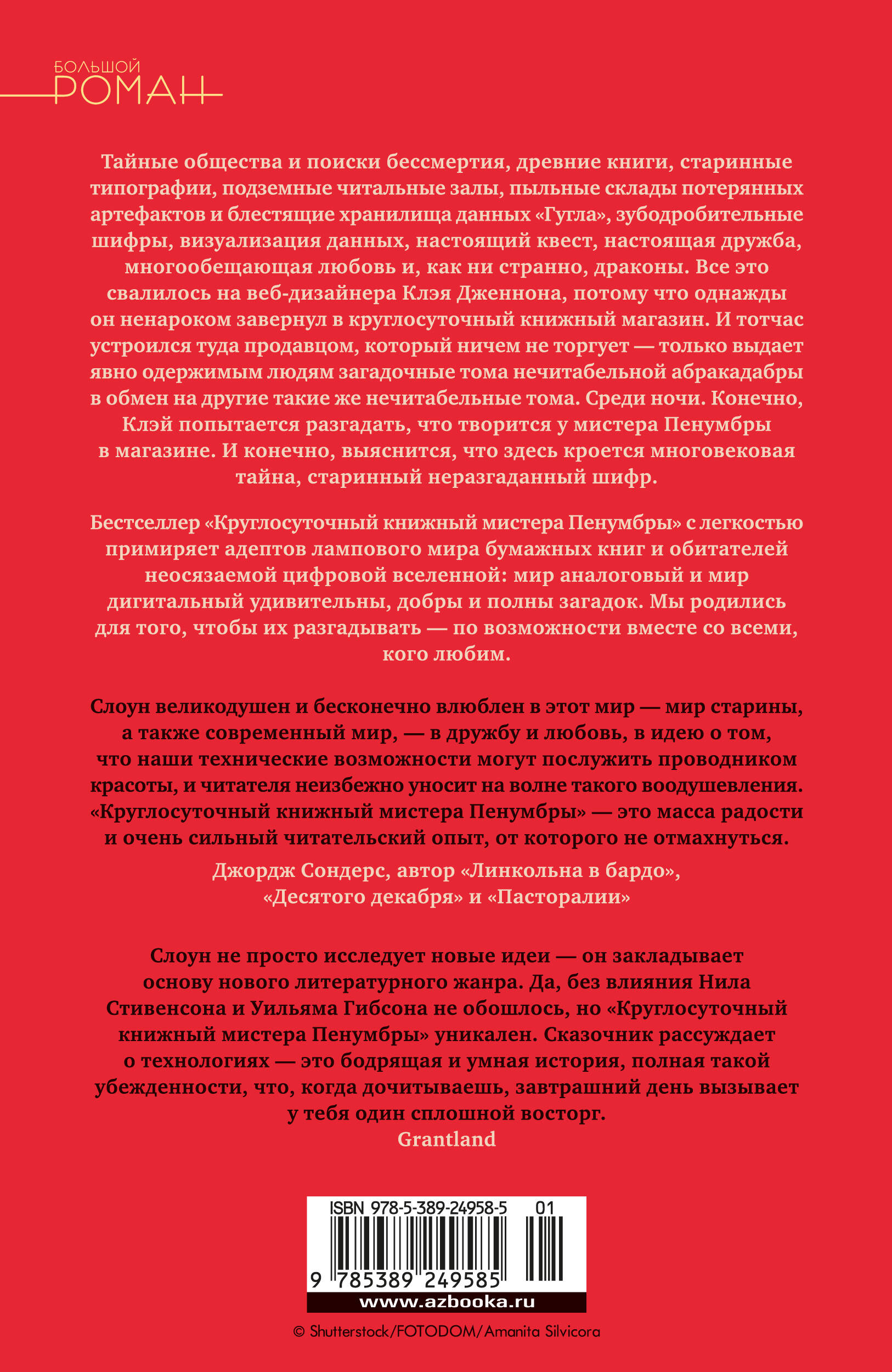 Тайные общества и поиски бессмертия, древние книги, старинные типографии, подземные читальные залы, пыльные склады потерянных артефактов и блестящие хранилища данных "Гугла", зубодробительные шифры, визуализация данных, настоящий квест, настоящая дружба, многообещающая любовь и, как ни странно, драконы. Все это свалилось на веб-дизайнера Клэя Дженнона, потому что он, потеряв работу и бесцельно блуждая по Сан-Франциско, ненароком завернул в круглосуточный (и, между прочим, вертикальный) книжный магазин. И тотчас устроился туда продавцом, который ничем не торгует - только выдает явно одержимым людям загадочные тома нечитабельной абракадабры в обмен на другие такие же нечитабельные тома. Среди ночи. Конечно, Клэй попытается разгадать, что творится у мистера Пенумбры в магазине. Конечно, выяснится, что здесь кроется многовековая тайна, старинный неразгаданный шифр. И этот шифр вместе с Клэем будут взламывать кодеры и библиотекари, археологи и дизайнеры, хакеры и музейные хранители, создатели спецэффектов и скалолазы. "Круглосуточный книжный мистера Пенумбры" побывал в списках бестселлеров The New York Times и National Public Radio, сразу после публикации был признан книгой года по версии Los Angeles Times, San Francisco Chronicle и NPR, а впоследствии издан в тридцати с лишним странах. Эта книга - поклон Нилу Стивенсону, Уильяму Гибсону, Харуки Мураками, Дэну Брауну и раннему Умберто Эко, но главным образом - футурологическим теориям самого Робина Слоуна, который с легкостью примиряет адептов лампового мира бумажных книг с обитателями неосязаемой цифровой вселенной, потому что просто-напросто не видит между ними противоречий. Мир аналоговый и мир дигитальный удивительны, добры и полны загадок. Мы родились для того, чтобы их разгадывать - по возможности вместе со всеми, кого любим. Роман "Круглосуточный книжный мистера Пенумбры" и его предыстория, повесть "Аякс Пенумбра 1969", публикуются в новом переводе и впервые под одной обложкой.| Издательство | Азбука-Аттикус Издат.группа ООО |
