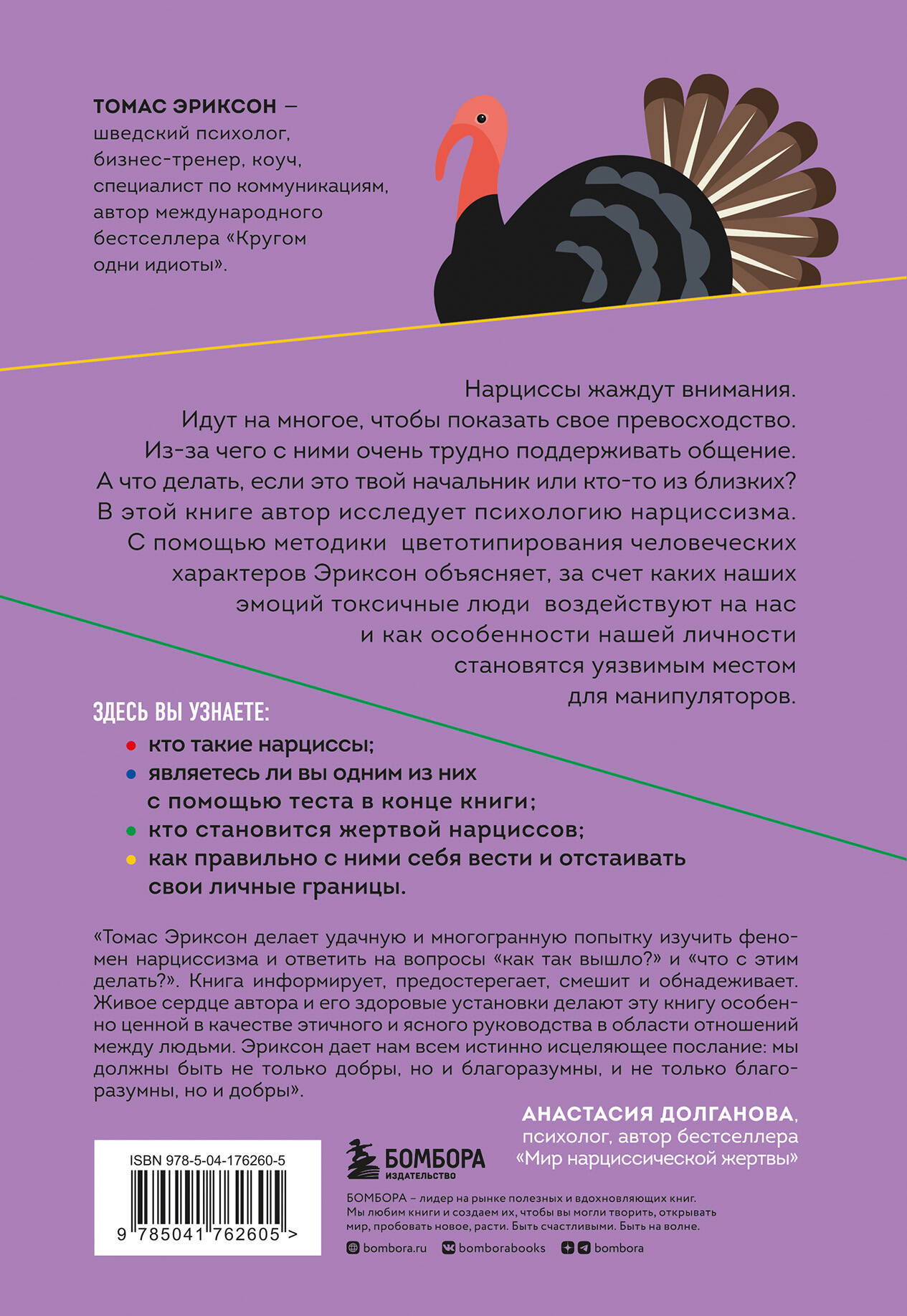 ТОМАС ЭРИКСОН - шведский психолог, бизнес-тренер, коуч, специалист по коммуникациям, автор международного бестселлера «Кругом одни идиоты». Нарциссы жаждут внимания. Идут на многое, чтобы показать свое превосходство. Из-за чего с ними очень трудно поддерживать общение. А что делать, если это твой начальник или кто-то из близких? В этой книге автор исследует психологию «нарциссизма». С помощью методики цветотипирования человеческих характеров Эриксон объясняет, за счет каких наших эмоций токсичные люди воздействуют на нас и как особенности нашей личности становятся уязвимым местом для манипуляторов. Здесь вы узнаете: - кто такие нарциссы; - являетесь ли вы одним из них - с помощью теста в конце книги; - кто становится жертвой нарциссов; - как правильно с ними себя вести и отстаивать свои личные границы.| Издательство | ООО "Издательство "Эксмо" |