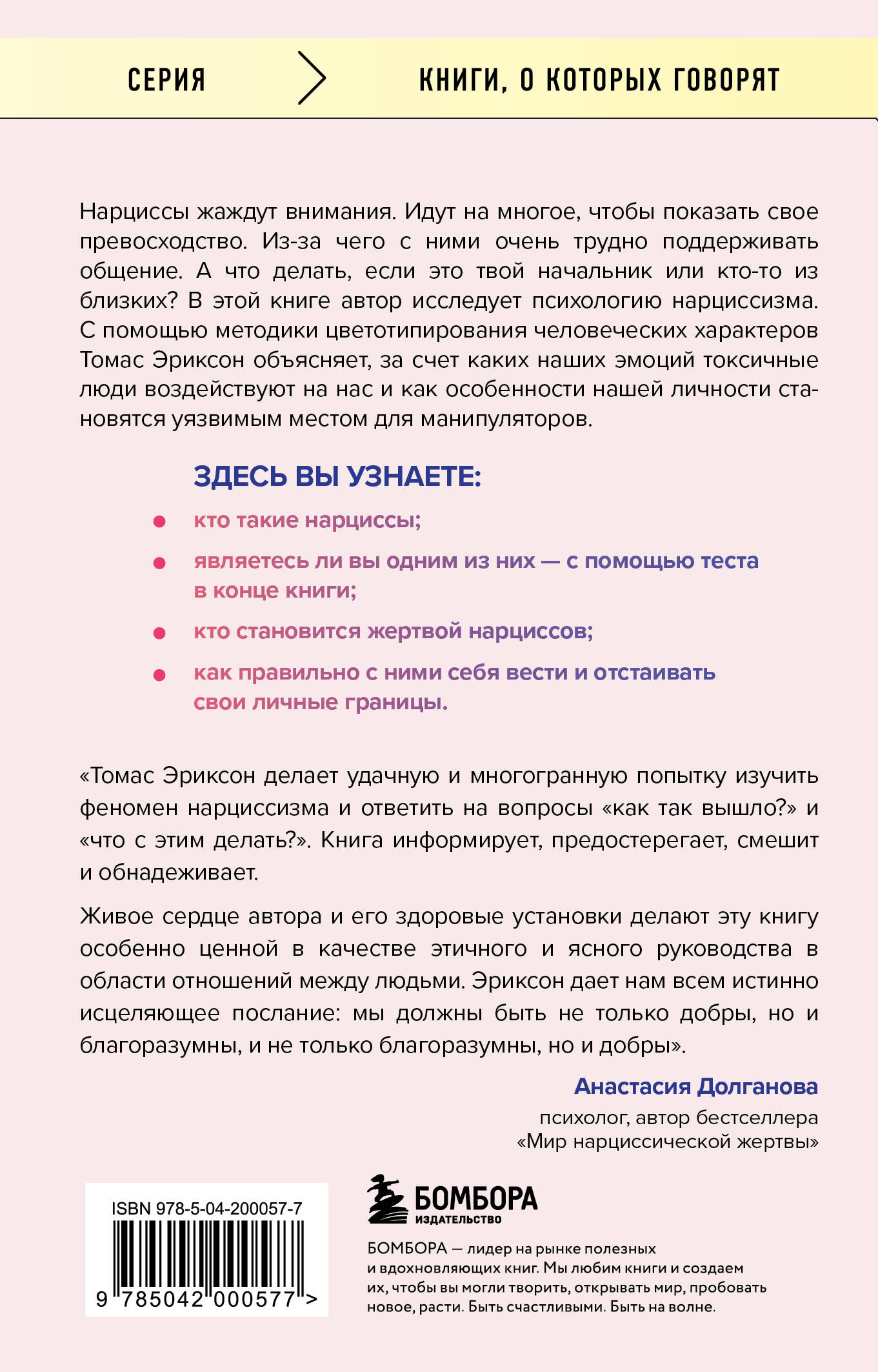 ТОМАС ЭРИКСОН - шведский психолог, бизнес-тренер, коуч, специалист по коммуникациям, автор международного бестселлера «Кругом одни идиоты». Нарциссы жаждут внимания. Идут на многое, чтобы показать свое превосходство. Из-за чего с ними очень трудно поддерживать общение. А что делать, если это твой начальник или кто-то из близких? В этой книге автор исследует психологию «нарциссизма». С помощью методики цветотипирования человеческих характеров Эриксон объясняет, за счет каких наших эмоций токсичные люди воздействуют на нас и как особенности нашей личности становятся уязвимым местом для манипуляторов. Здесь вы узнаете: - кто такие нарциссы; - являетесь ли вы одним из них - с помощью теста в конце книги; - кто становится жертвой нарциссов; - как правильно с ними себя вести и отстаивать свои личные границы.| Издательство | ООО "Издательство "Эксмо" |