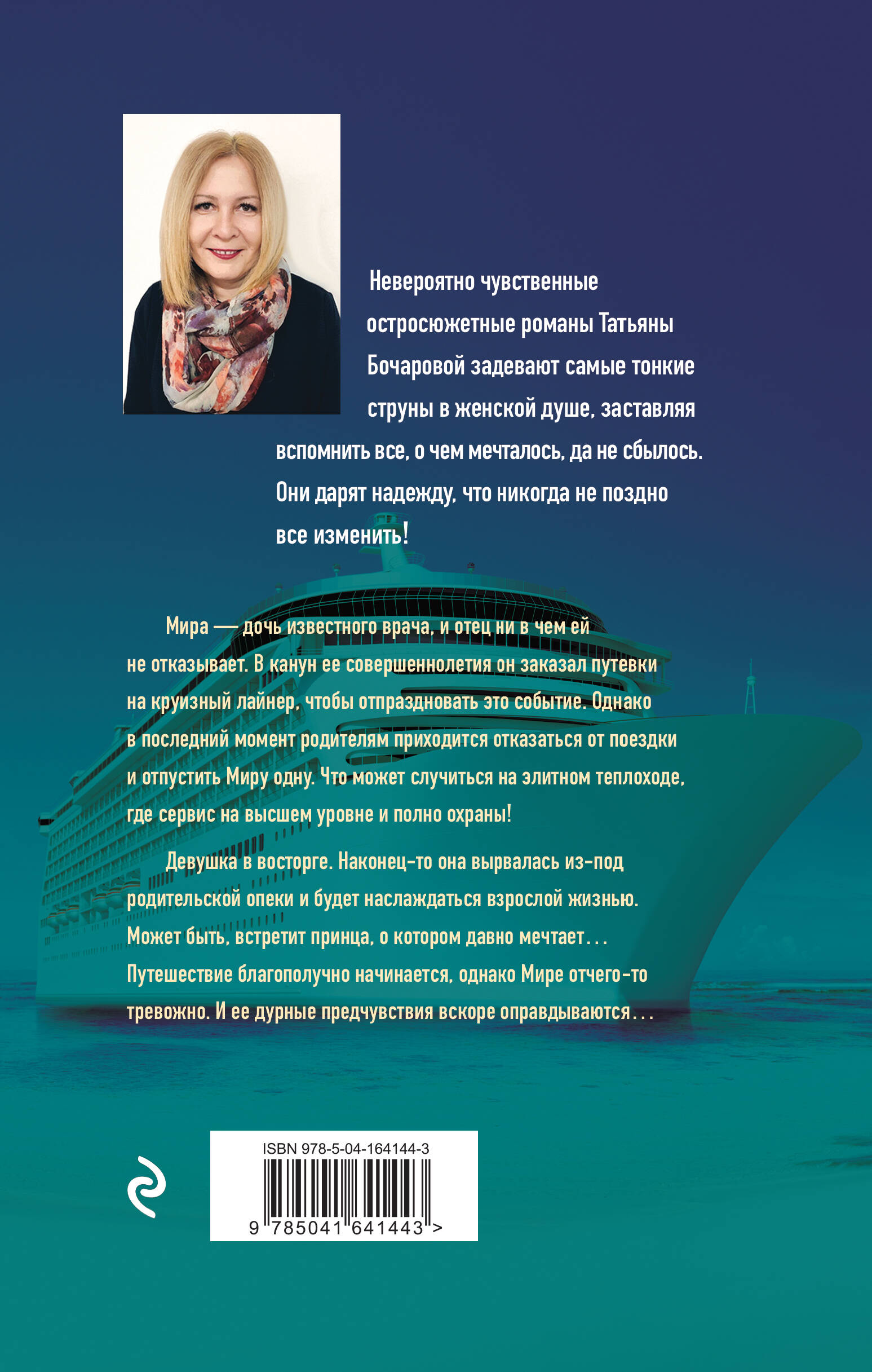 НЕЗАКОННОЕ ПОТРЕБЛЕНИЕ НАРКОТИЧЕСКИХ СРЕДСТВ, ПСИХОТРОПНЫХ ВЕЩЕСТВ, ИХ АНАЛОГОВ ПРИЧИНЯЕТ ВРЕД ЗДОРОВЬЮ, ИХ НЕЗАКОННЫЙ ОБОРОТ ЗАПРЕЩЕН И ВЛЕЧЕТ УСТАНОВЛЕННУЮ ЗАКОНОДАТЕЛЬСТВОМ ОТВЕТСТВЕННОСТЬ. Мира - дочь известного на всю столицу врача. Отец балует ее, ни в чем не отказывая. В канун совершеннолетия Миры он заказал путевки на круизный лайнер, чтобы отпраздновать это событие. Однако в последний момент родителям приходится отказаться от поездки и отпустить Миру одну. Что может случиться на элитном теплоходе, где сервис на высшем уровне и полно охраны! Девушка в восторге. Наконец-то она вырвалась из-под родительской опеки и будет наслаждаться взрослой жизнью. И, может быть, встретит принца, о котором она давно мечтает… Путешествие благополучно начинается, однако Мире отчего-то тревожно. И ее дурные предчувствия вскоре оправдываются… Детективные мелодрамы Татьяны Бочаровой из серии «Детектив сильных страстей» - увлекательные остросюжетные романы, где действительность узнаваема, в героях можно увидеть себя и своих близких, прописаны традиционные ценности, добро в финале побеждает зло и справедливость торжествует.| Издательство | ООО "Издательство "Эксмо" |