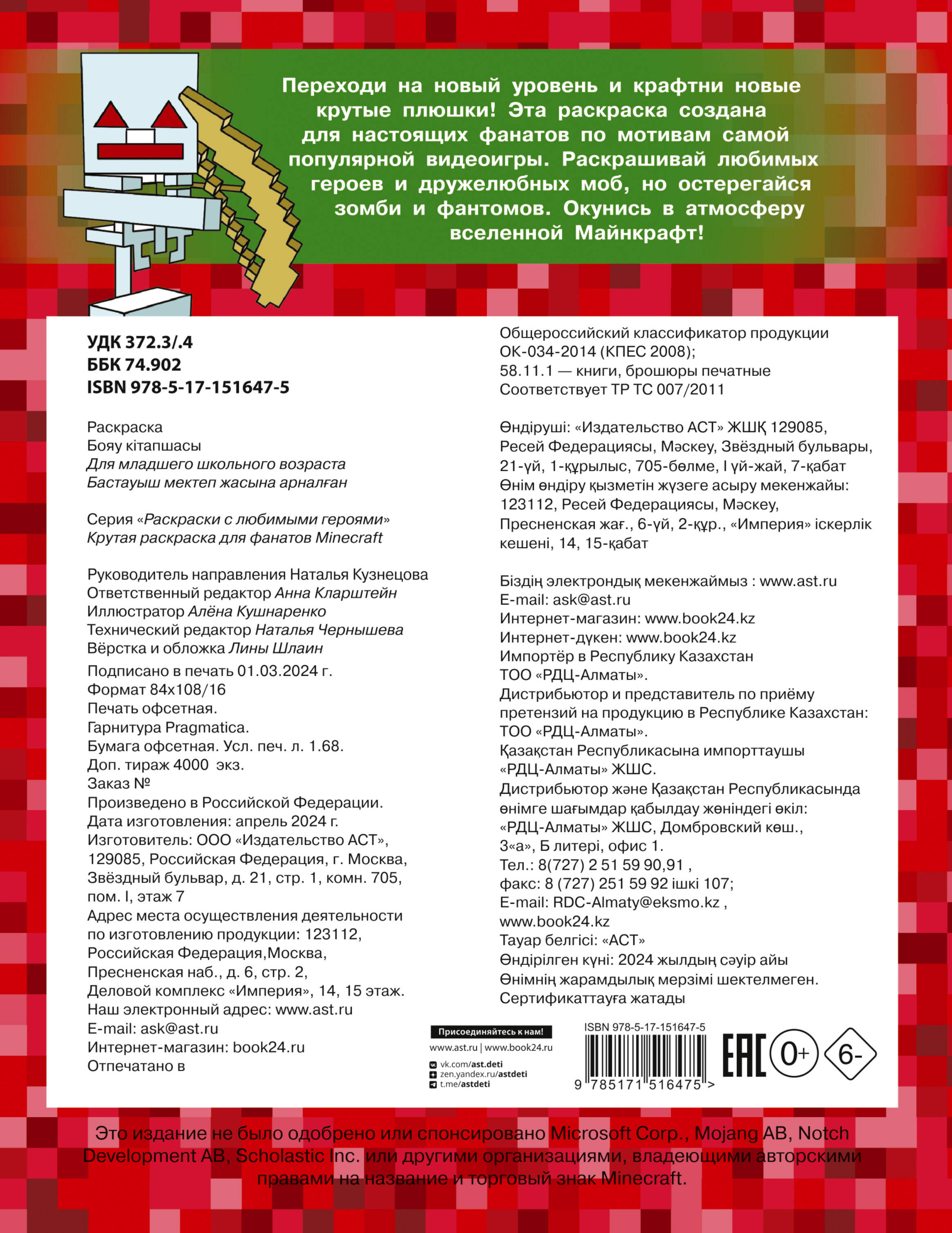 Переходи на новый уровень и крафтни новые крутые плюшки! Эта раскраска создана для настоящих фанатов по мотивам самой популярной видеоигры. Раскрашивай любимых героев и дружелюбных моб, но остерегайся зомби и фантомов. Окунись в атмосферу вселенной Майнкрафт!| Издательство | ИЗДАТЕЛЬСТВО "АСТ" |