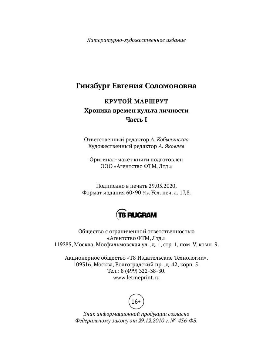 Автобиографический роман советской журналистки Евгении Гинзбург (1904-1977), над которым она работала с 1967 года и до своей смерти. Это одно из первых литературных произведений, рассказывающих о сталинских репрессиях. В первой части романа автор описывает события с момента убийства Кирова, свой арест и первые два года заключения в одиночной камере тюрьмы Ярославля.| Издательство | Т8 RUGRAM |