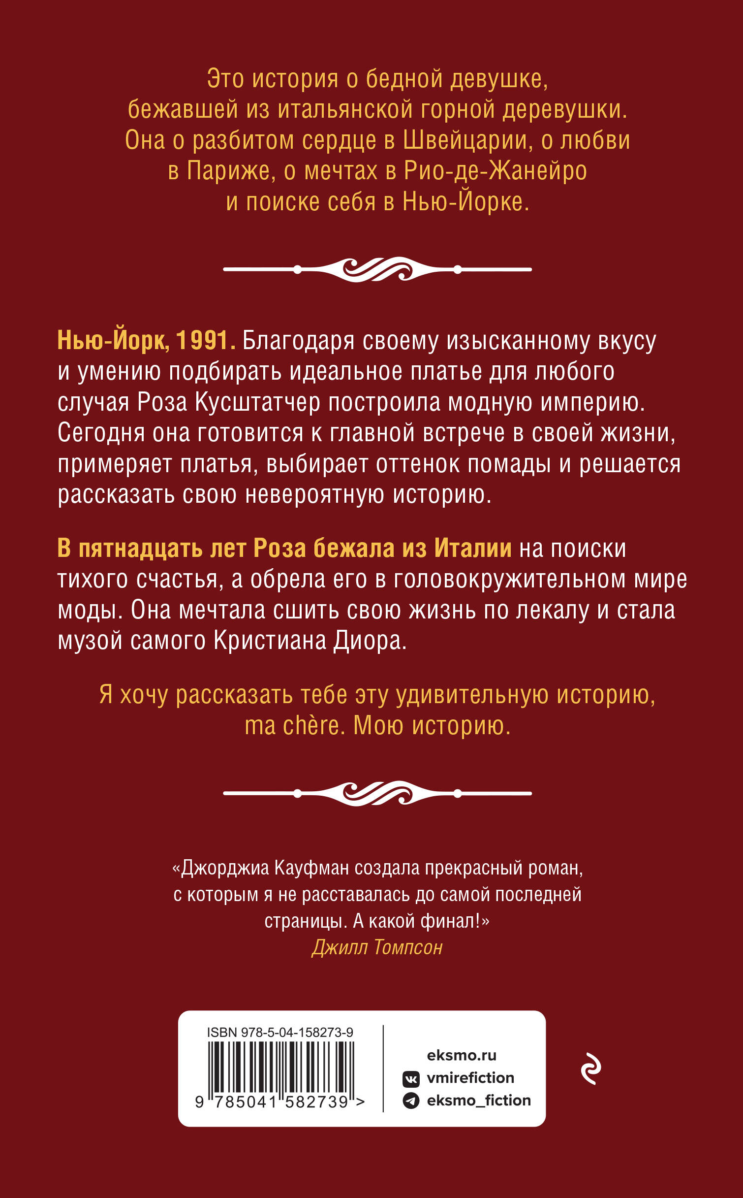 Мир - ее сцена. И она будет танцевать под свою музыку. Так, как умеет только настоящая женщина. Идеальный роман для тех, кто давно мечтал побывать сразу в пяти странах, встретиться с Кристианом Диором и найти свое роскошное платье. Это история о бедной девушке, бежавшей из итальянской горной деревушки. Она о разбитом сердце в Швейцарии, о любви в Париже, о мечтах в Рио-де-Жанейро и поиске себя в Нью-Йорке. Нью-Йорк, 1991. Благодаря своему изысканному вкусу и умению подбирать идеальное платье для любого случая Роза Кусштатчер построила модную империю. Сегодня она готовится к главной встрече в своей жизни, примеряет платья, выбирает оттенок помады и решается рассказать свою невероятную историю. В пятнадцать лет Роза бежала из Италии на поиски тихого счастья, а обрела его в головокружительном мире моды. Она мечтала сшить свою жизнь по лекалу и стала музой самого Кристиана Диора. «Я хочу рассказать тебе эту удивительную историю, ma chère. Мою историю».| Издательство | ООО "Издательство "Эксмо" |