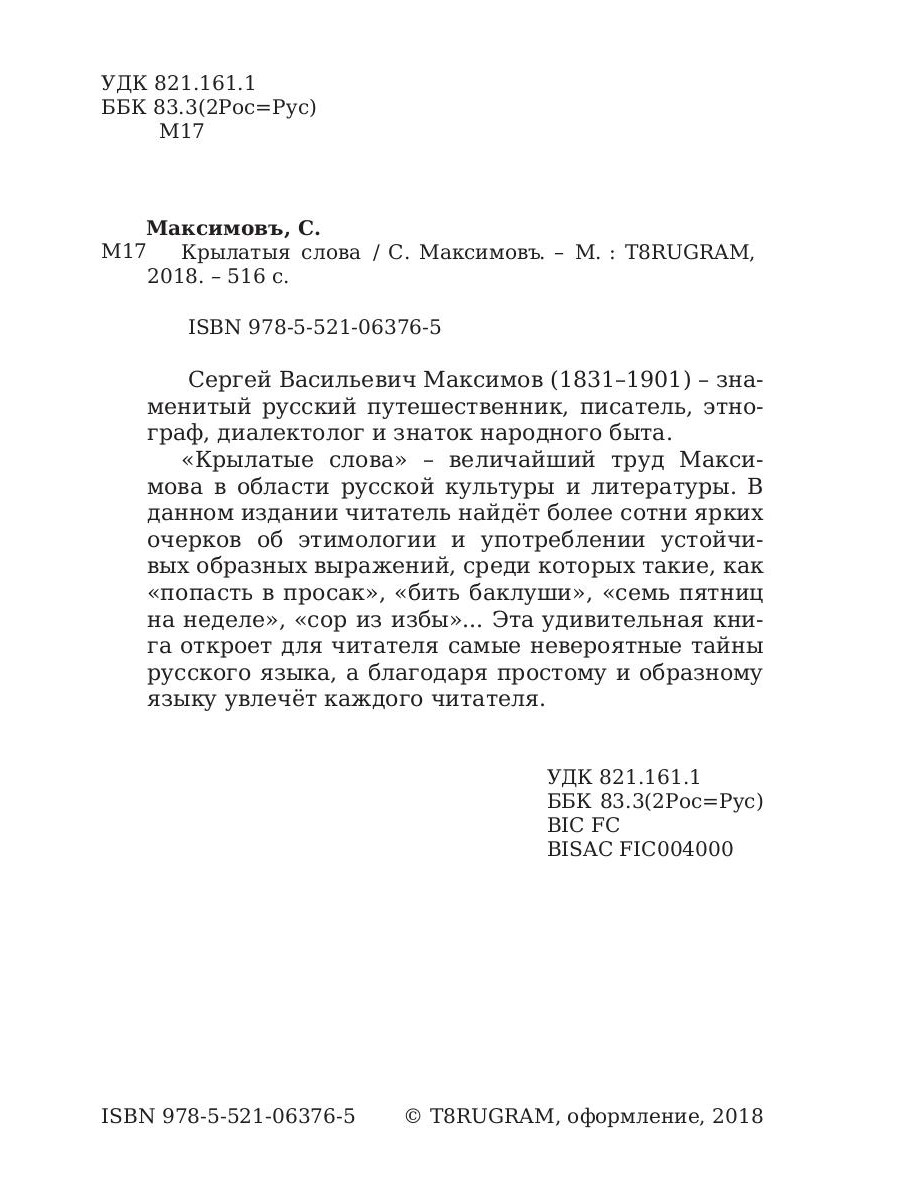«Крылатые слова» - величайший труд Максимова в области русской культуры и литературы. В данном издании читатель найдёт более сотни ярких очерков об этимологии и употреблении устойчивых образных выражений, среди которых такие, как «попасть в просак», «бить баклуши», «семь пятниц на неделе», «сор из избы»... Эта удивительная книга откроет для читателя самые невероятные тайны русского языка, а благодаря простому и образному языку увлечёт каждого читателя.