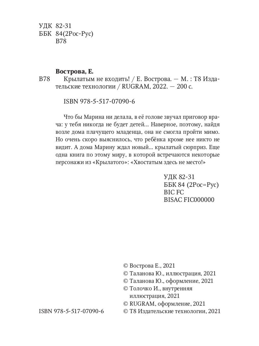 Что бы Марина ни делала, в её голове звучал приговор врача: у тебя никогда не будет детей... Наверное, поэтому, найдя возле дома плачущего младенца, она не смогла пройти мимо. Но очень скоро выяснилось, что ребёнка кроме нее никто не видит. А дома Марину ждал новый... крылатый сюрприз. Еще одна книга по этому миру, в которой встречаются некоторые персонажи из «Крылатого»: «Хвостатым здесь не место!»| Издательство | Т8 RUGRAM |