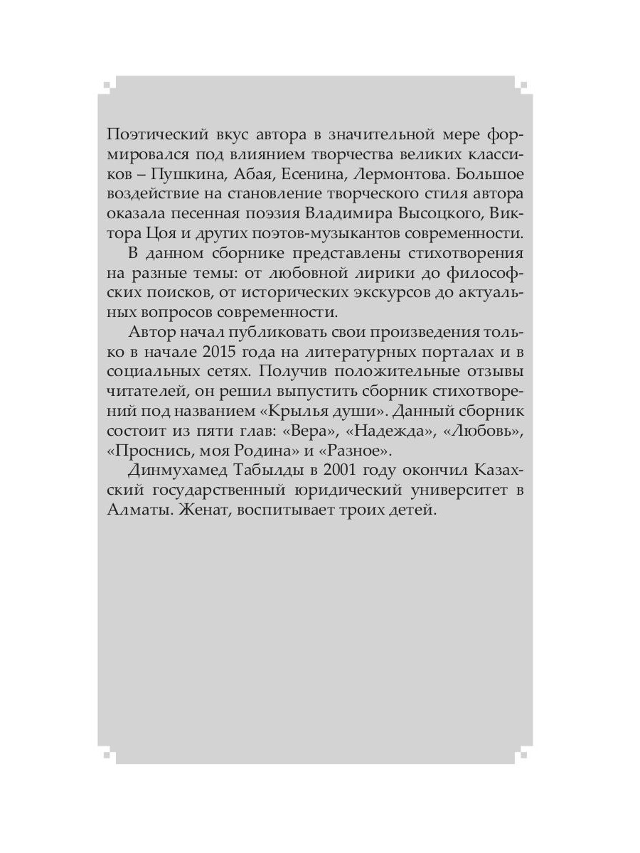 В данном сборнике стихов под названием «Крылья души» представлены стихотворения казахстанского поэта Динмухамеда Табылды на разные тему - от любовной лирики до философских поисков, от исторических экскурсов до актуальных вопросов современности. Данный сборник состоит из пяти глав: «Вера», «Надежда», «Любовь», «Проснись, моя Родина» и «Разное».| Издательство | Т8 RUGRAM |