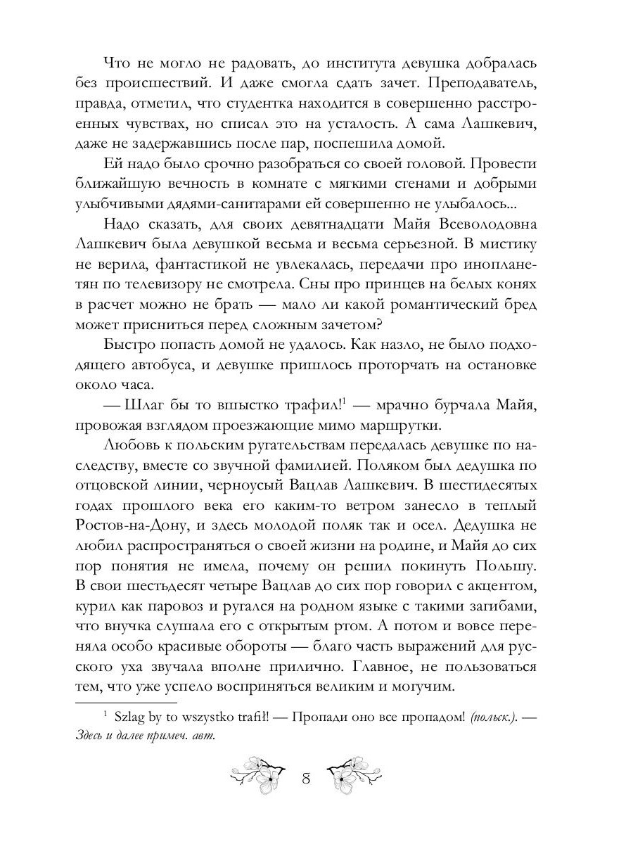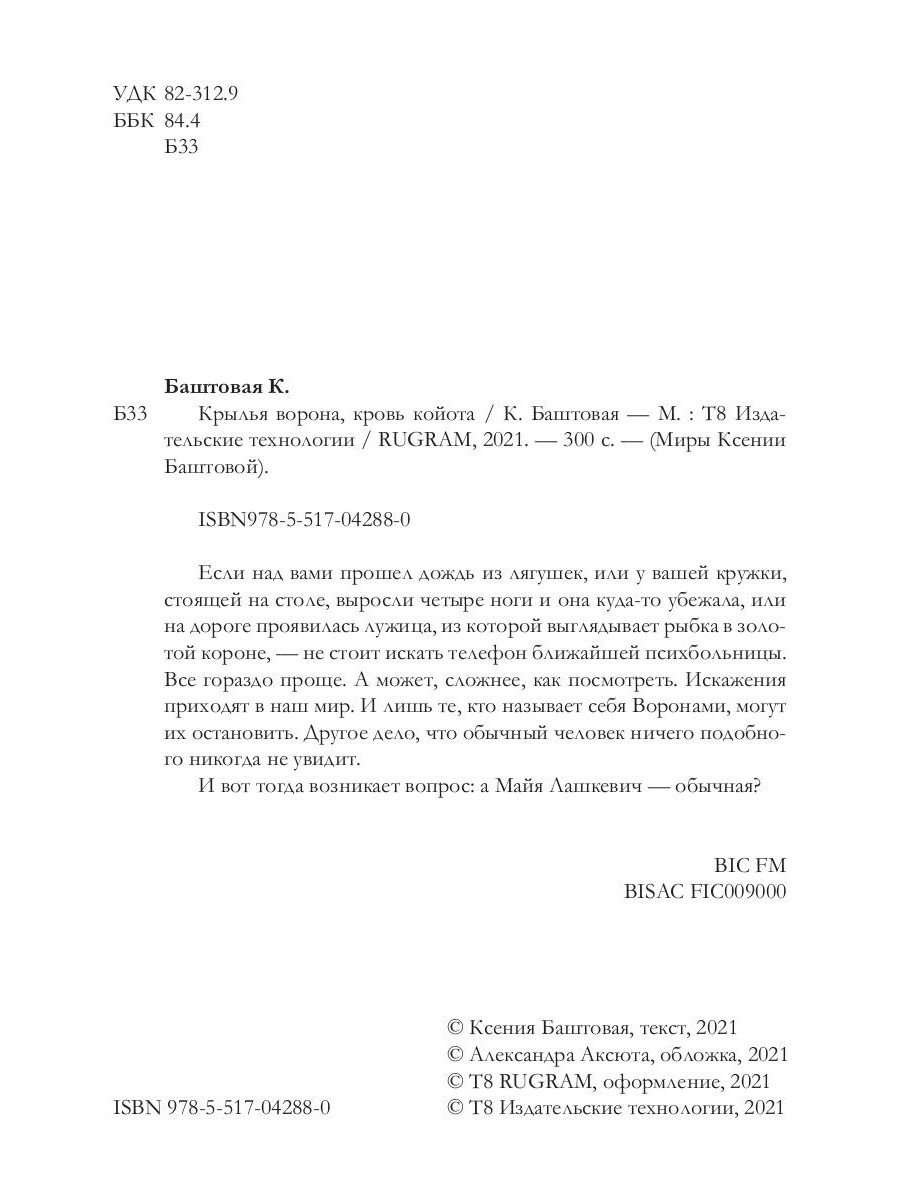 Если над вами прошел дождь из лягушек, или у вашей кружки, стоящей на столе, выросли четыре ноги и она куда-то убежала, или на дороге проявилась лужица, из которой выглядывает рыбка в золотой короне, - не стоит искать телефон ближайшей психбольницы. Все гораздо проще. А может, сложнее, как посмотреть. Искажения приходят в наш мир. И лишь те, кто называет себя Воронами, могут их остановить. Другое дело, что обычный человек ничего подобного никогда не увидит. И вот тогда возникает вопрос: а Майя Лашкевич - обычная?| Издательство | Т8 RUGRAM |