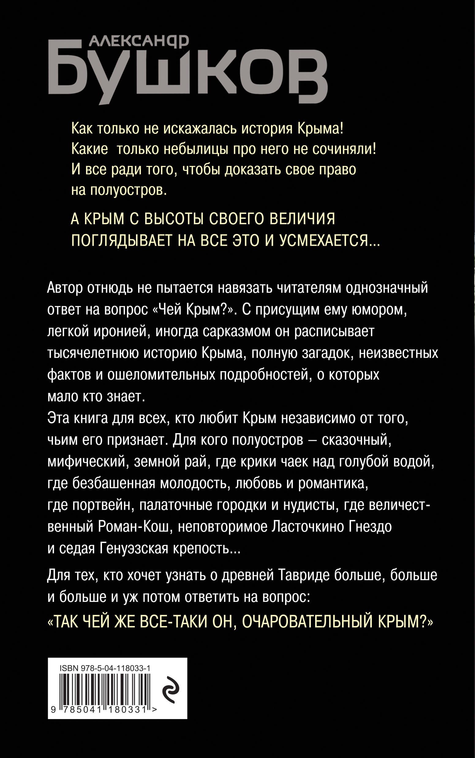 Эту книгу очень ждали. Нужно было перевести дух, успокоиться и со всей ответственностью погрузиться в изучение вопроса. Александр Бушков это сделал. Здесь нет назиданий, строгих догм и безапелляционных выводов. Только любовь. Только факты и логика. И знаменитая «бушковская» ирония. Автор отнюдь не пытается навязать читателям однозначный ответ на вопрос: «Чей Крым?» С присущим ему юмором, легкой иронией, иногда сарказмом он расписывает тысячелетнюю историю Крыма, полную загадок, неизвестных фактов и ошеломительных подробностей, о которых мало кто знает. Эта книга для всех, кто любит Крым независимо от того, чьим его признает. Для кого полуостров - сказочный, мифический, земной рай, где крики чаек над голубой водой, где безбашенная молодость, любовь и романтика, где портвейн, палаточные городки и нудисты, где величественный Роман-Кош, неповторимое Ласточкино Гнездо и седая Генуэзская крепость… Для тех, кто хочет узнать о древней Тавриде больше, больше и больше, и уж потом ответить на вопрос: «Так чей же все-таки он, очаровательный Крым?» Это незаменимая книга для всех, кто хочет разобраться в вопросе, который вот уже шесть лет муссируют наши друзья и недруги. Это обязательная книга для тех, кто планирует отдохнуть в Крыму, но еще чего-то боится. Это настольная книга для патриотов, имперцев и всех тех, для кого слово «Родина» - не пустой звук.| Издательство | ООО "Издательство "Эксмо" |