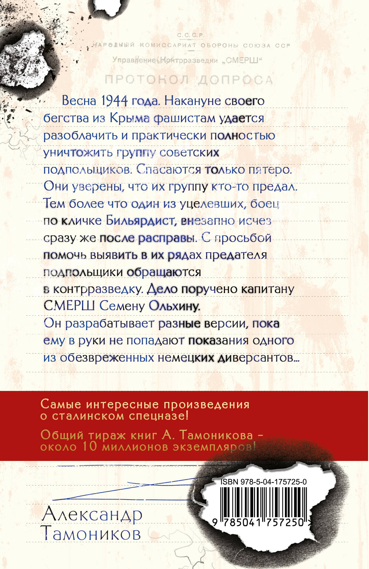 Самые интересные романы о сталинском спецназе - СМЕРШе. Весна 1944 года. Накануне своего бегства из Крыма фашистам удается разоблачить и практически полностью уничтожить группу советских подпольщиков. Спасаются только пятеро. Они уверены, что их группу кто-то предал. Тем более что один из уцелевших, боец по кличке Бильярдист, внезапно исчез сразу же после расправы. С просьбой помочь выявить в их рядах предателя подпольщики обращаются в контрразведку. Дело поручено капитану СМЕРШа Семену Ольхину. Он начинает прорабатывать разные версии, пока ему в руки не попадают показания одного из обезвреженных немецких диверсантов… «Смерть шпионам!» (СМЕРШ) - это короткое и беспощадное название носило особое подразделение НКВД, подчинявшееся И. Сталину. Созданное в годы войны, оно состояло из проверенных в бою, честных и бесстрашных офицеров Красной Армии. СМЕРШа боялись все - и фашистские лазутчики, готовящие диверсии в наших боевых порядках, и гитлеровские приспешники, действующие в глубоком советском тылу. Враг знал: если на его след напали бойцы сталинского спецназа, справедливого и скорого суда не избежать. Романы серии «СМЕРШ - спецназ Сталина» - это каждый раз увлекательный динамичный сюжет и новые исторические знания, это экшен, написанный простым и понятным языком. Общий тираж книг А. Тамоникова - более 10 миллионов экземпляров!| Издательство | ООО "Издательство "Эксмо" |