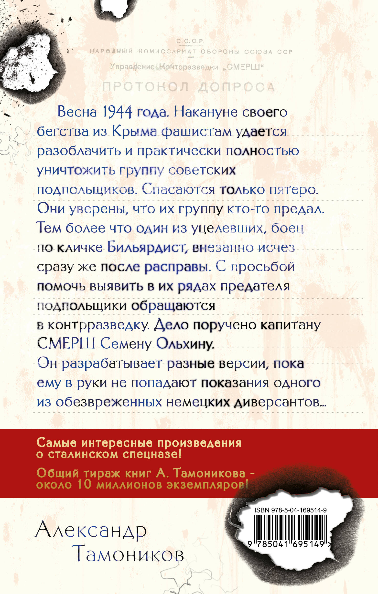 Самые интересные романы о сталинском спецназе - СМЕРШе. Весна 1944 года. Накануне своего бегства из Крыма фашистам удается разоблачить и практически полностью уничтожить группу советских подпольщиков. Спасаются только пятеро. Они уверены, что их группу кто-то предал. Тем более что один из уцелевших, боец по кличке Бильярдист, внезапно исчез сразу же после расправы. С просьбой помочь выявить в их рядах предателя подпольщики обращаются в контрразведку. Дело поручено капитану СМЕРШа Семену Ольхину. Он начинает прорабатывать разные версии, пока ему в руки не попадают показания одного из обезвреженных немецких диверсантов… «Смерть шпионам!» (СМЕРШ) - это короткое и беспощадное название носило особое подразделение НКВД, подчинявшееся И. Сталину. Созданное в годы войны, оно состояло из проверенных в бою, честных и бесстрашных офицеров Красной Армии. СМЕРШа боялись все - и фашистские лазутчики, готовящие диверсии в наших боевых порядках, и гитлеровские приспешники, действующие в глубоком советском тылу. Враг знал: если на его след напали бойцы сталинского спецназа, справедливого и скорого суда не избежать. Романы серии «СМЕРШ - спецназ Сталина» - это каждый раз увлекательный динамичный сюжет и новые исторические знания, это экшен, написанный простым и понятным языком. Общий тираж книг А. Тамоникова - более 10 миллионов экземпляров!| Издательство | ООО "Издательство "Эксмо" |
