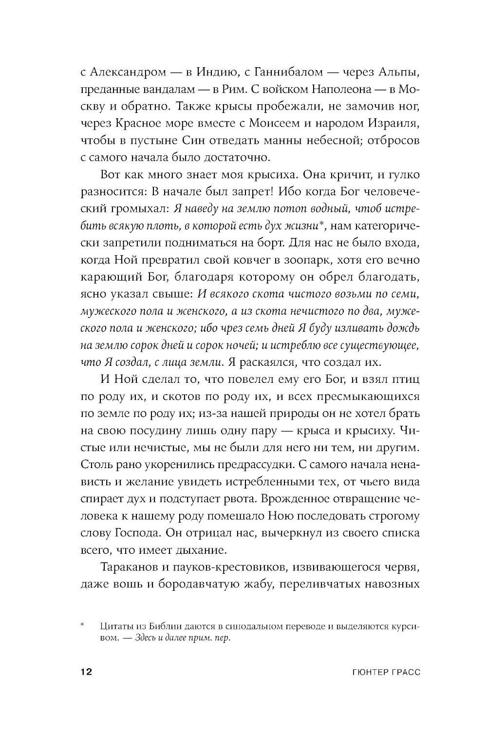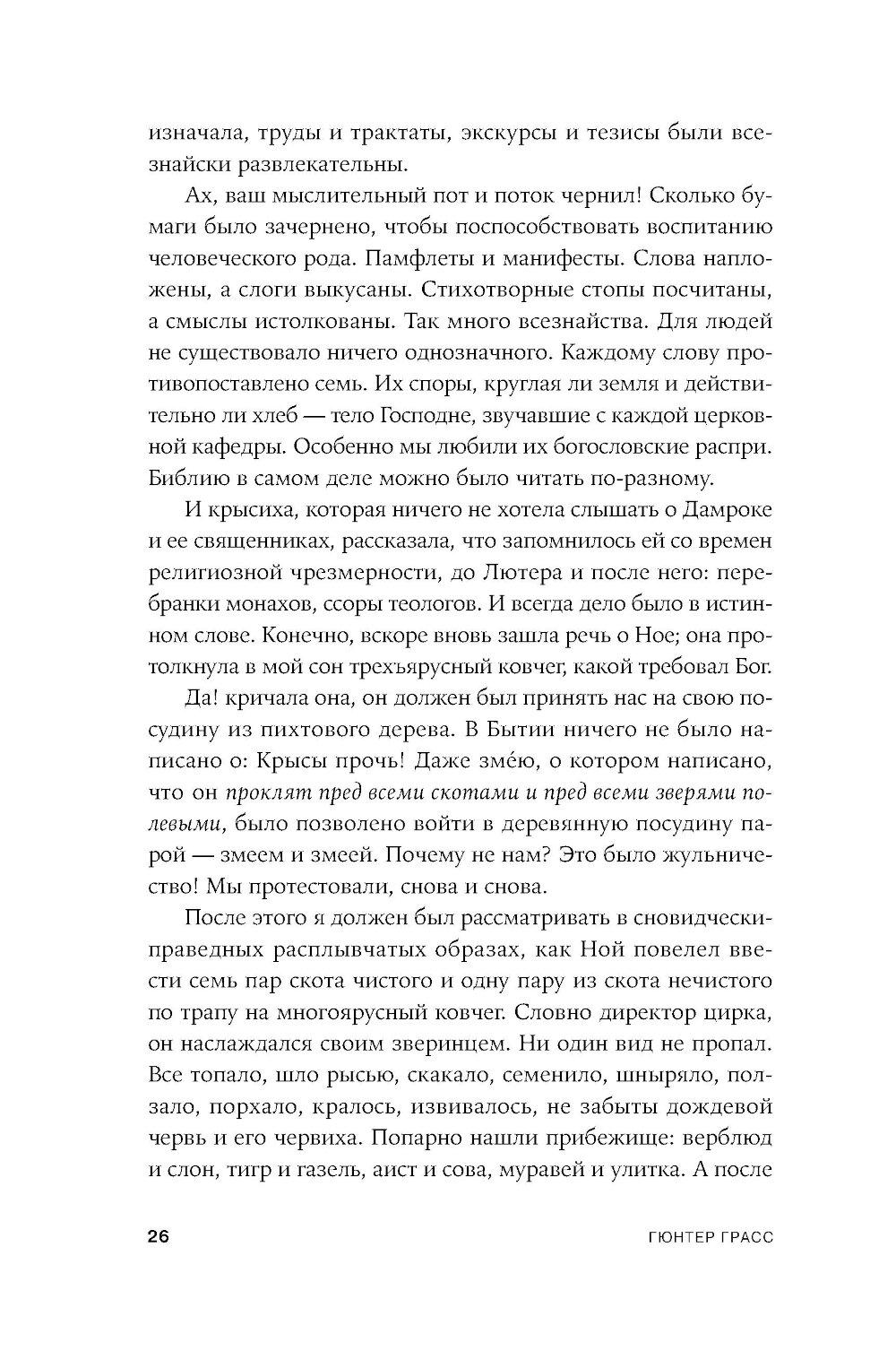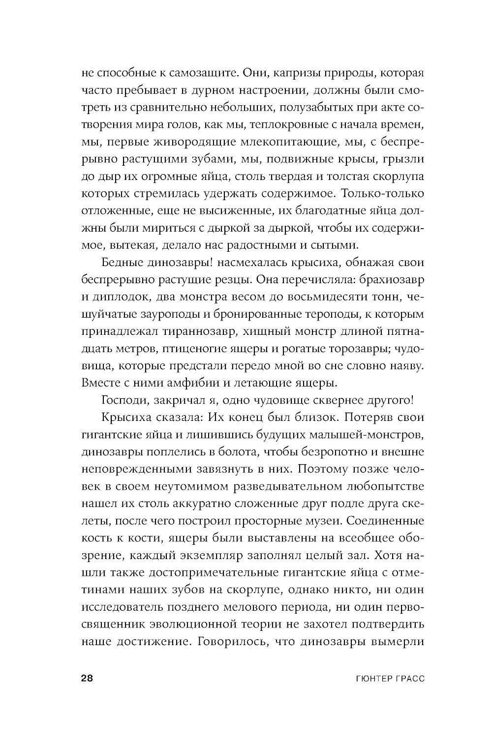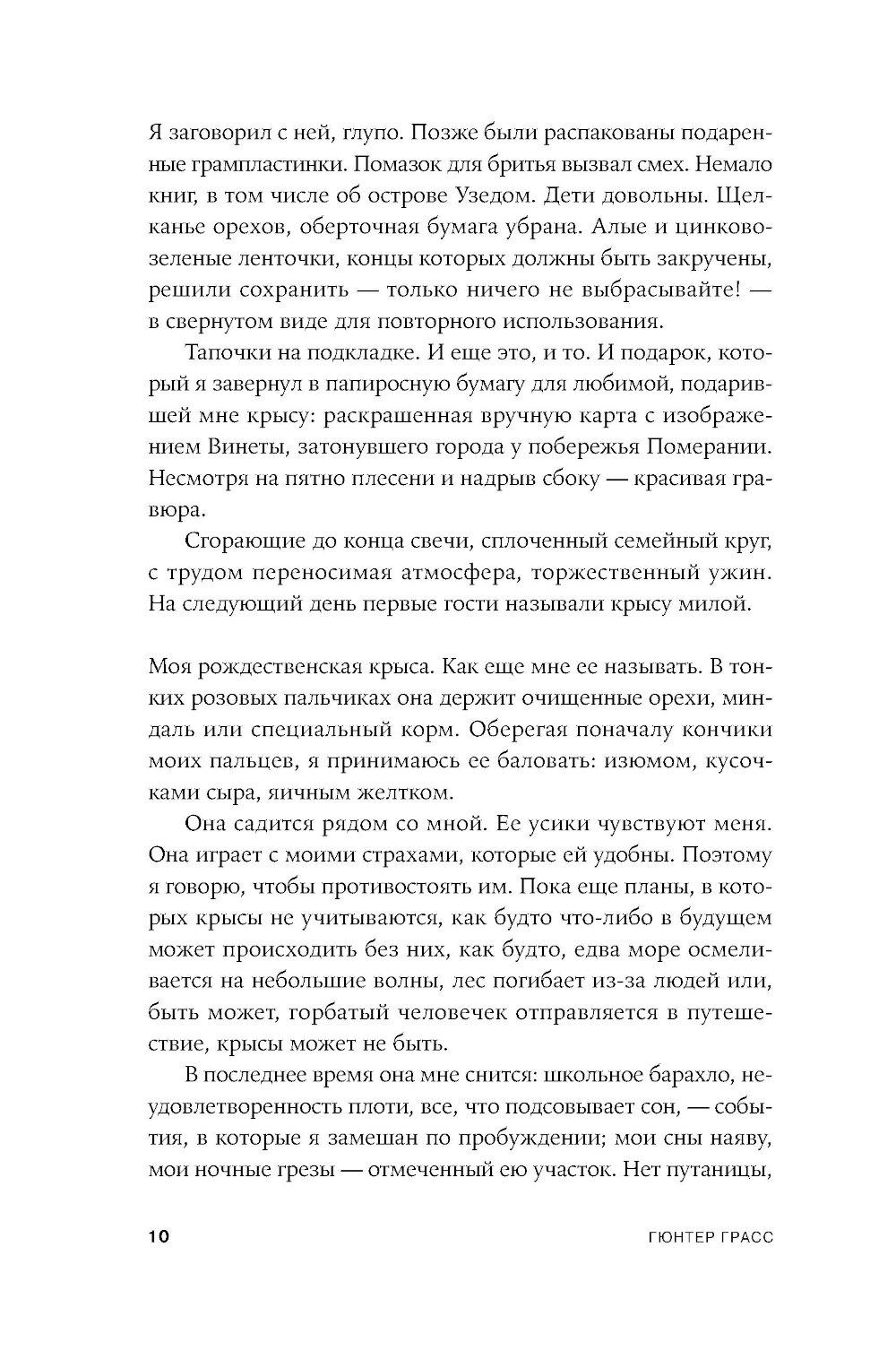 Апокалиптический роман немецкого писателя Гюнтера Грасса, построенный на диалоге рассказчика с подаренной ему крысой. Он путешествует по опустошенной Земле, а она излагает ему историю гибели человечества и захвата власти на Земле крысами - единственными выжившими в Данциге после применения нейтронных бомб и построившими собственную цивилизацию, основанную на солидарности. Рассказчик спорит с новой картиной мира, выдвигая свои теории, которые становятся возможными сценариями для фильмов медиамагната, героя «Жестяного барабана» Оскара Мацерата: о художнике Лотаре Мальскате и проблеме подлинности, о мертвых лесах, о пяти женщинах, которые отправляются исследовать местную популяцию медуз в Балтийском море и тайно ищут легендарную Винету как место женской утопии.| Издательство | Альпина нон-фикшн |