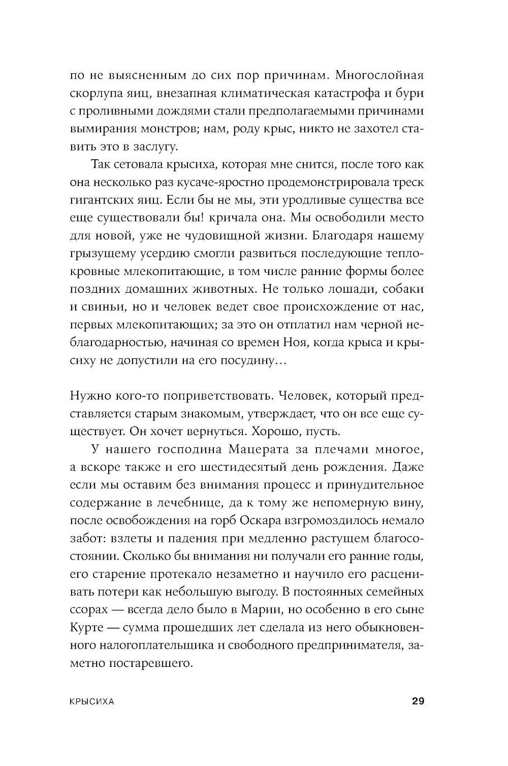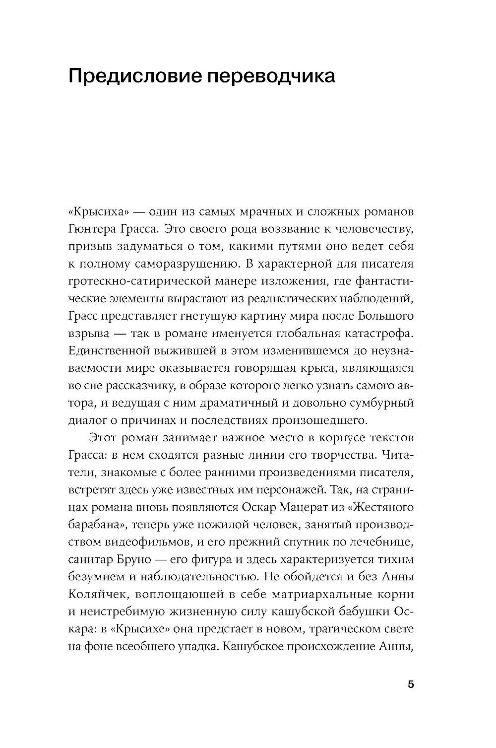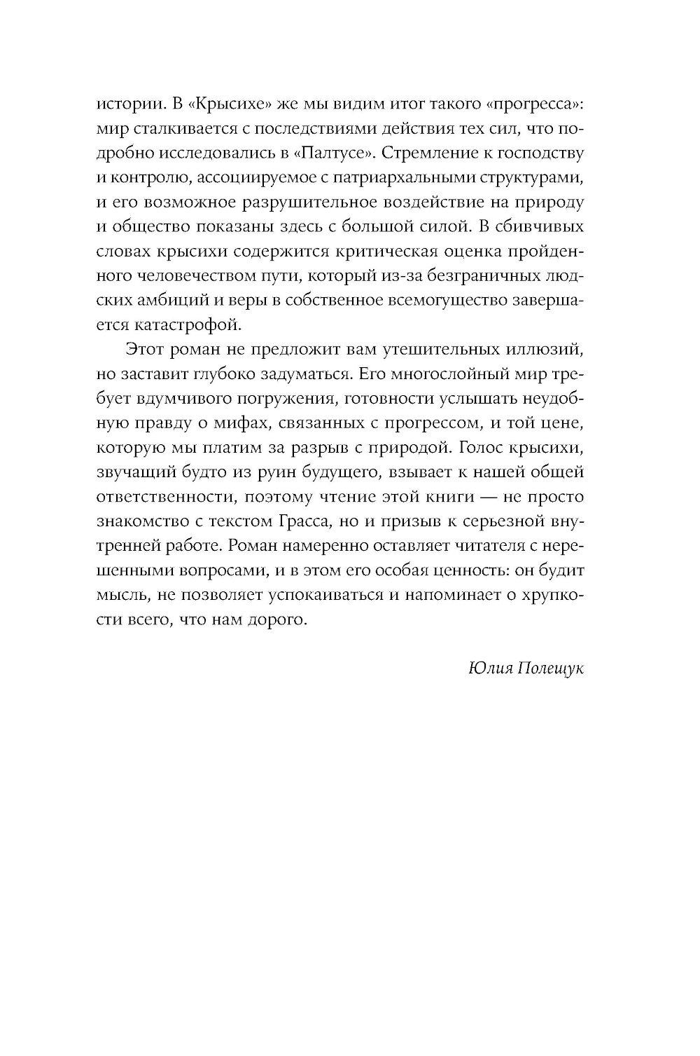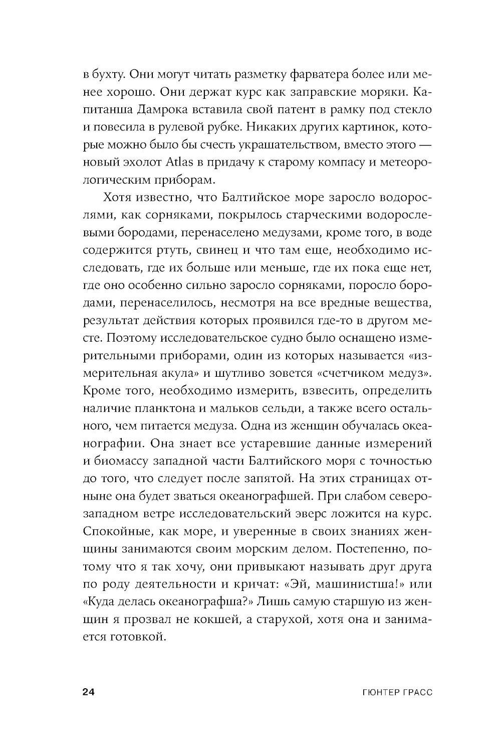 Апокалиптический роман немецкого писателя Гюнтера Грасса, построенный на диалоге рассказчика с подаренной ему крысой. Он путешествует по опустошенной Земле, а она излагает ему историю гибели человечества и захвата власти на Земле крысами - единственными выжившими в Данциге после применения нейтронных бомб и построившими собственную цивилизацию, основанную на солидарности. Рассказчик спорит с новой картиной мира, выдвигая свои теории, которые становятся возможными сценариями для фильмов медиамагната, героя «Жестяного барабана» Оскара Мацерата: о художнике Лотаре Мальскате и проблеме подлинности, о мертвых лесах, о пяти женщинах, которые отправляются исследовать местную популяцию медуз в Балтийском море и тайно ищут легендарную Винету как место женской утопии.| Издательство | Альпина нон-фикшн |
