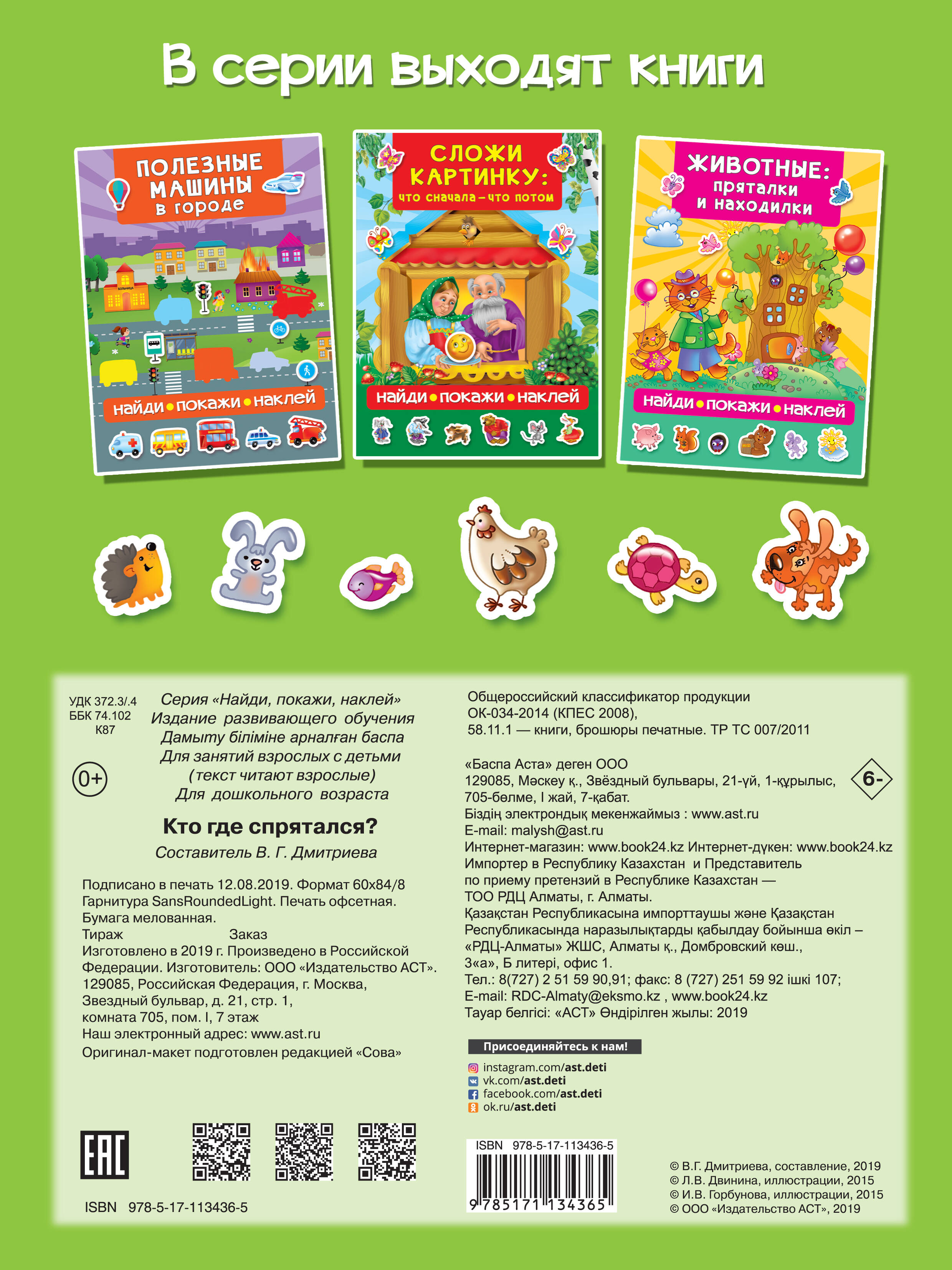 О чём эта книга «Кто где спрятался» - это красочно иллюстрированная книжка с наклейками, которая позволит малышу развить мелкую моторику, внимательность и навык счёта, расширить кругозор. Кому эта книга будет интересна Книга предназначена для детей дошкольного возраста. Каковы особенности этой книги • Работа с наклейками способствует развитию мелкой моторики. • Задания помогут малышу развить навыки счёта, расширить кругозор. • Красочные иллюстрации с животными не дадут ребёнку заскучать. • Занимайтесь по книге вместе с малышом - это отличный способ весело и с пользой провести свободное время.