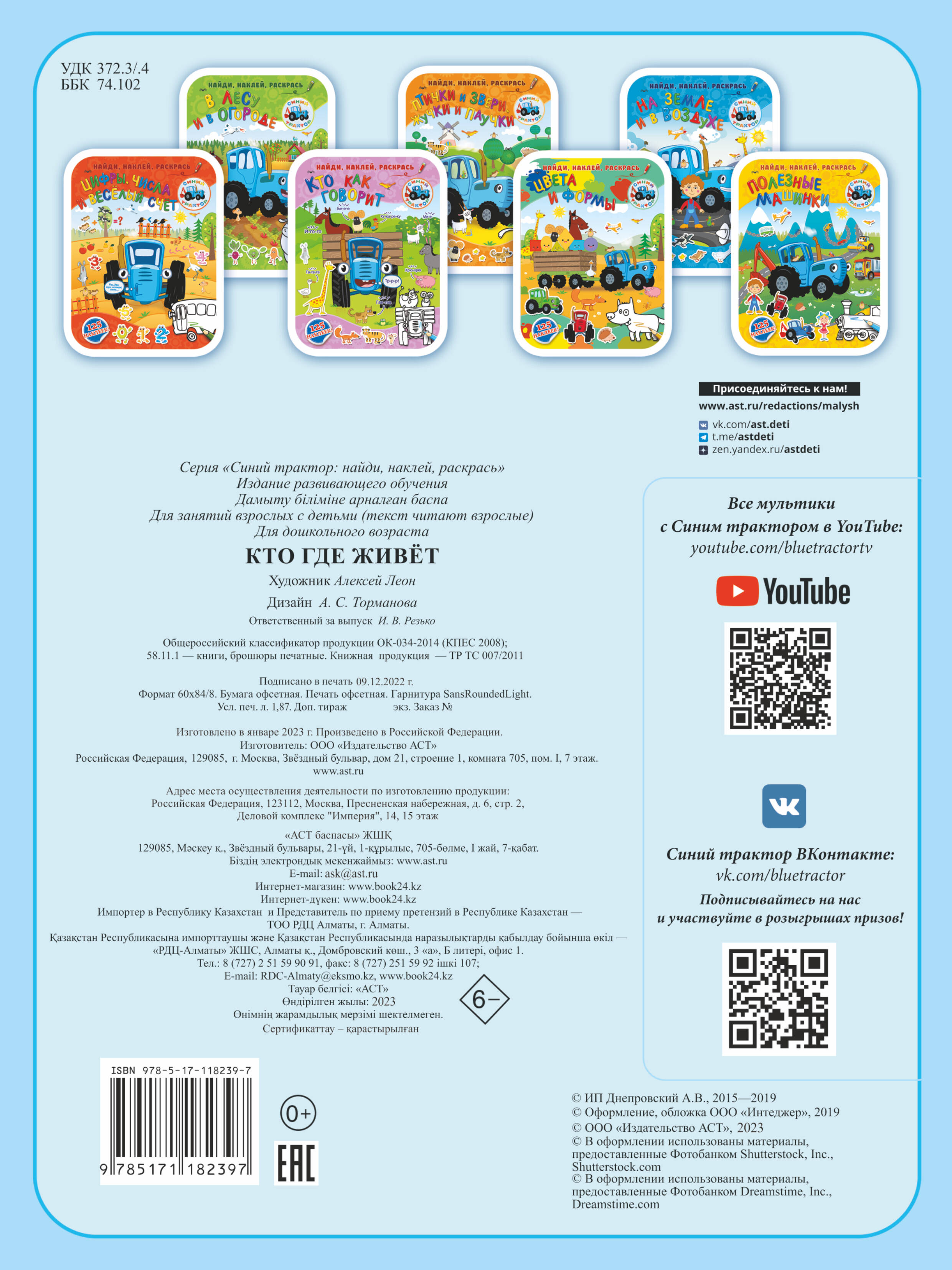 Синий трактор - известный персонаж развивающего мультпроекта, собравшего миллионы просмотров и подписчиков в сети Интернет. На страницах книги "Кто где живет" малыши отправятся в увлекательное путешествие с героями полюбившихся мультфильмов, поиграют с наклейками, выполнят занимательные задания. А ещё здесь есть раскраски, которые нравятся абсолютно всем детям. Для дошкольного возраста.| Издательство | Издательство "АСТ" |