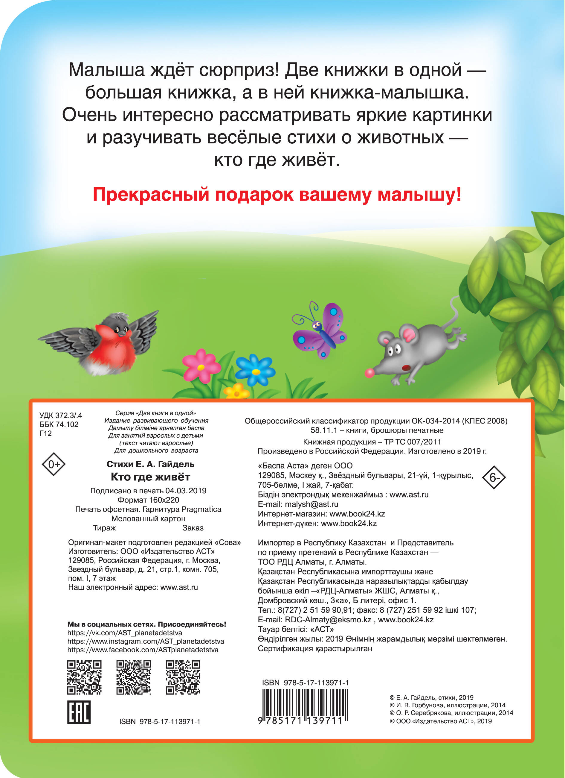 О чем эта книга Две вырубные книжки в одной - большая и маленькая - о том, где живут животные. Кому эта книга будет интересна Любознательным малышам и заботливым родителям! Каковы особенности этой книги • Две вырубные книжки в одной - большая и маленькая. • Красочные иллюстрации и забавные стихи о местах обитания животных. • Плотный картон высокого качества. • Играя с этой книжкой, малыш развивает мелкую моторику, мышление, фантазию. • Прекрасный подарок для ребёнка.| Издательство | ИЗДАТЕЛЬСТВО "АСТ" |