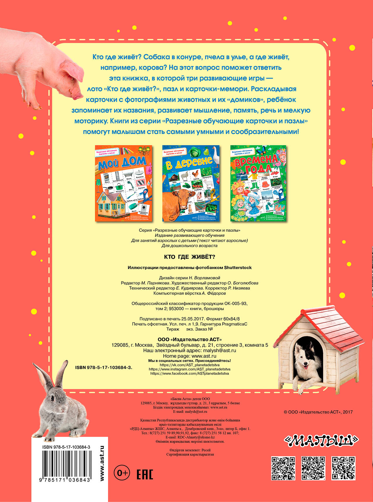 Обучение в игре - самый эффективный способ дать ребёнку необходимые для его возраста знания. У вас в руках уникальная книжка для самых маленьких, с помощью которой ваш малыш с лёгкостью выучит названия животных и их «домиков». В этой большой цветной книжке целых три развивающих игры - лото «Кто где живёт?», пазл и карточки-мемори. Все карточки после игры можно убрать в специальную коробочку, чтобы они не потерялись! Серия «Разрезные обучающие карточки и пазлы» - это отличный способ рассказать ребёнку об окружающем мире.| Издательство | ИЗДАТЕЛЬСТВО "АСТ" |