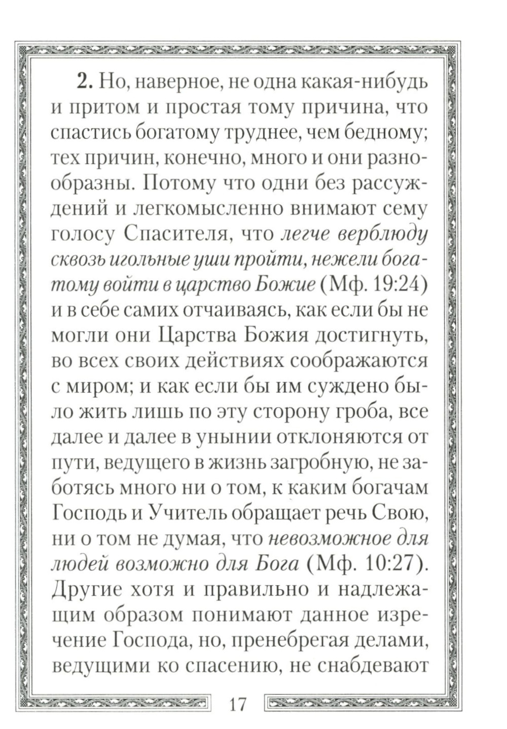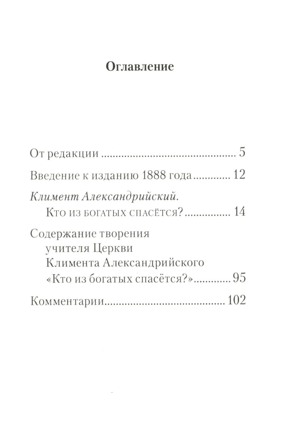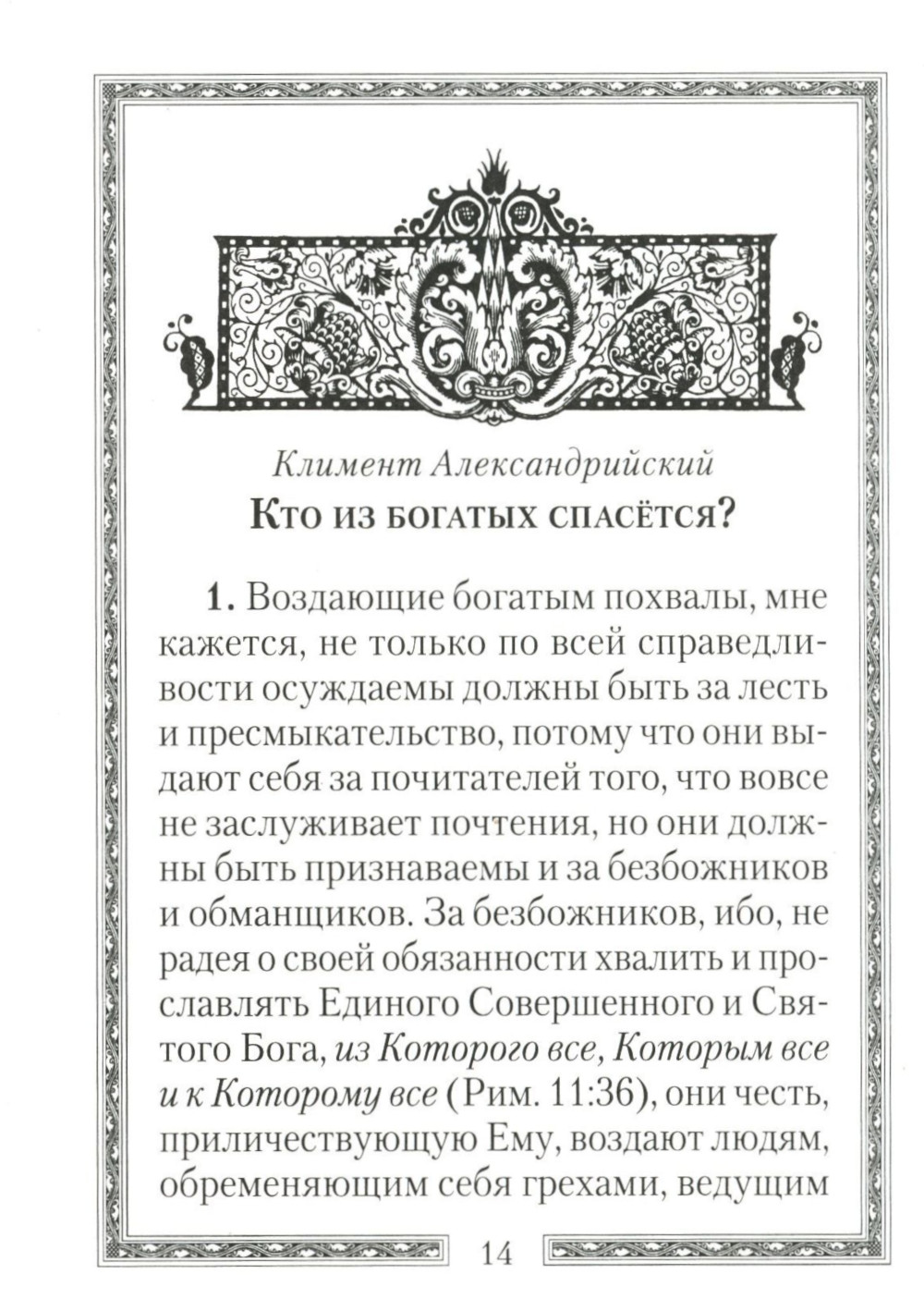Вниманию читателя предлагается небольшое произведение древнехристианского учителя Климента Александрийского (150-215) "Кто из богатых спасётся?". Оно посвящено толкованию евангельского фрагмента Мф. 19:16-30, но в то же время затрагивает ряд важных для христианской жизни тем. В этом произведении автор дает оригинальное и глубокое понимание богатства и бедности. Губительно не само по себе имущество и золото, но пристрастие к ним владельцев. Для правильно распоряжающихся богатством оно может становиться при известных условиях даже спасительным. Книга является весьма актуальной в современную эпоху экономических потрясений и может стать своего рода руководством для правильного духовного отношения к происходящему.| Издательство | Сибирская благозвонница** |