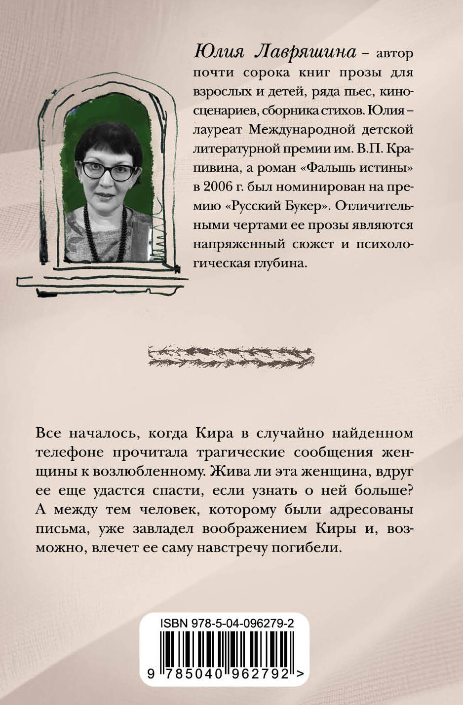 Все началось, когда Кира в случайно найденном телефоне прочитала трагические сообщения женщины к возлюбленному. Жива ли эта женщина, вдруг ее еще удастся спасти, если узнать о ней больше? А между тем человек, которому были адресованы письма, уже завладел воображением Киры и, возможно, влечет ее саму навстречу погибели.| Издательство | ООО "Издательство "Эксмо" |