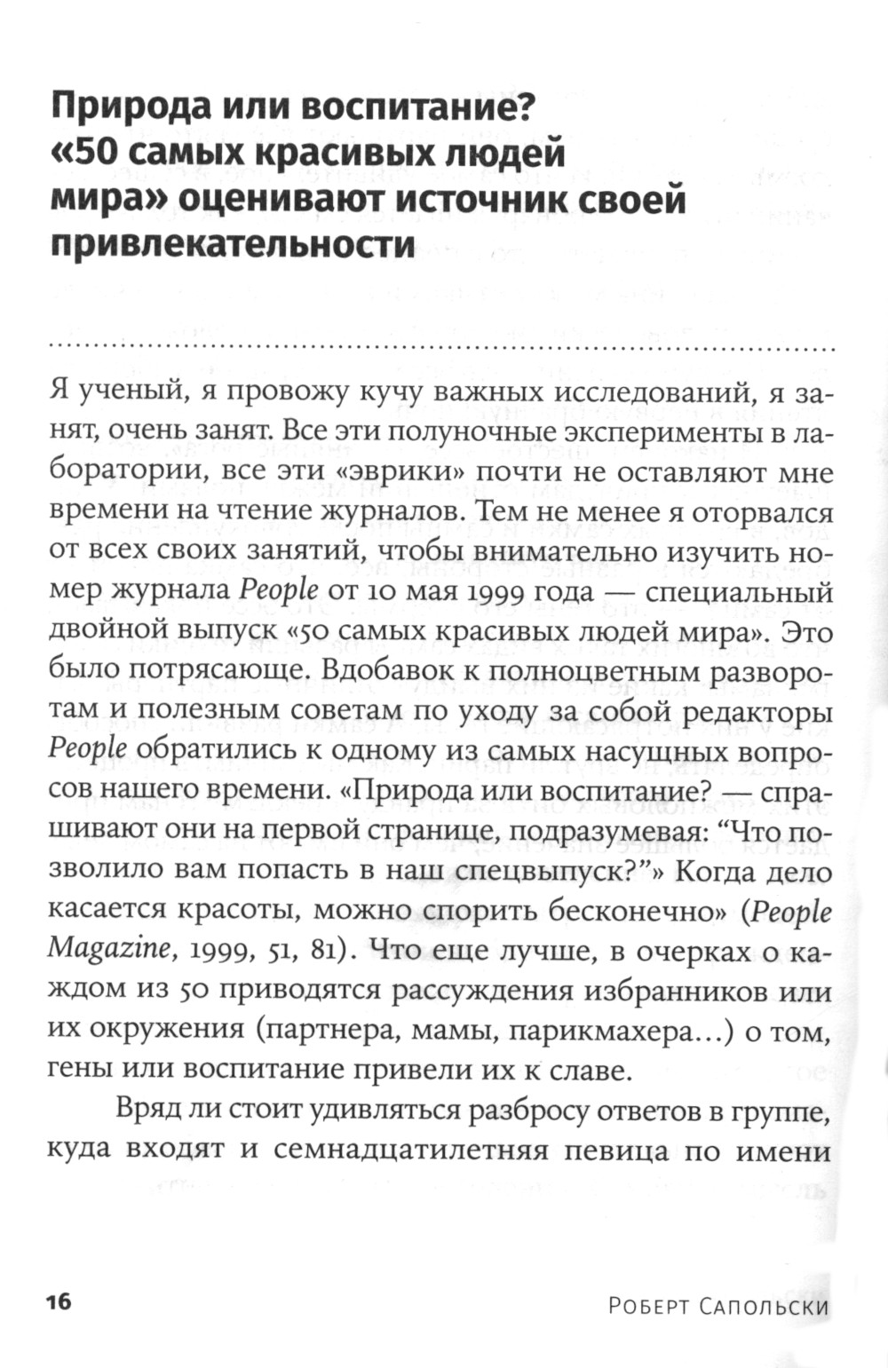 Как климат влияет на интеллект, характер, религиозные представления? Правда ли, что наш мозг сжимается от стресса? Какова анатомия плохого настроения? Почему старые звери не хотят пробовать новую еду и как это связано с творческим долголетием человека? Всегда ли здоровье у богатых лучше, чем у бедных? Что такое синдром Мюнхгаузена по доверенности? Поистине человеческое существо - одно из самых загадочных животных на Земле. В книге всемирно известного приматолога и нейробиолога Роберта Сапольски написанные им в разные годы блистательные эссе образуют целостную картину человеческой природы. В шутливой манере известный ученый рассматривает нешуточные вопросы о влиянии генов и среды на наше поведение, о биологической подоплеке социальных процессов, о войне полов в мире животных, включая Homo sapiens, и вообще о том, как трудно человеку быть человеком.| Издательство | Альпина нон-фикшн |