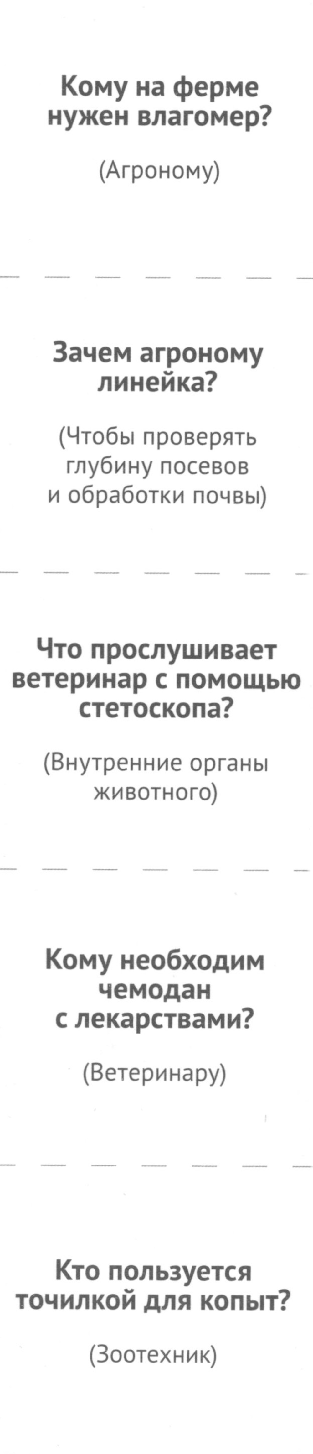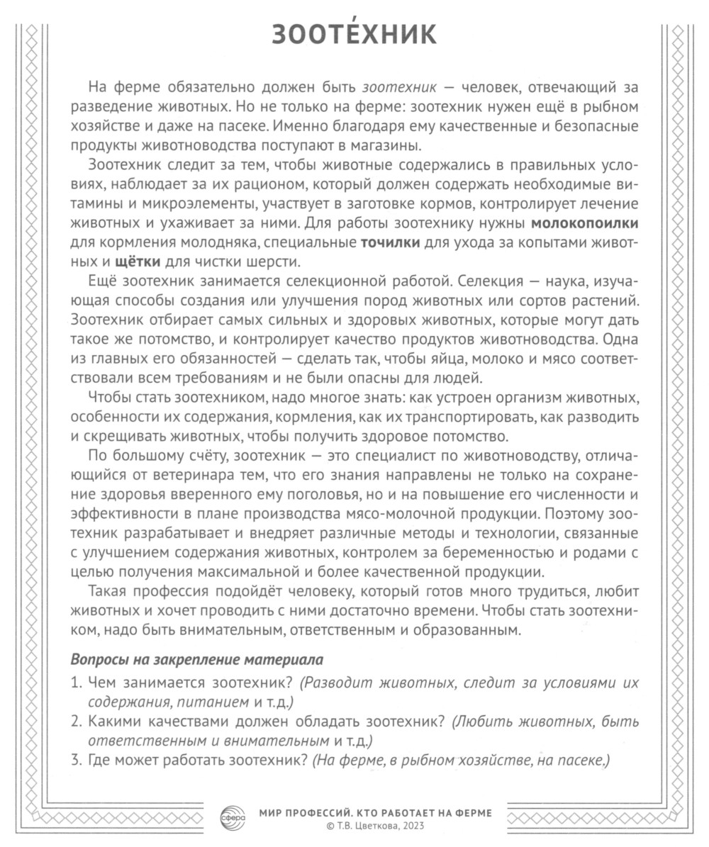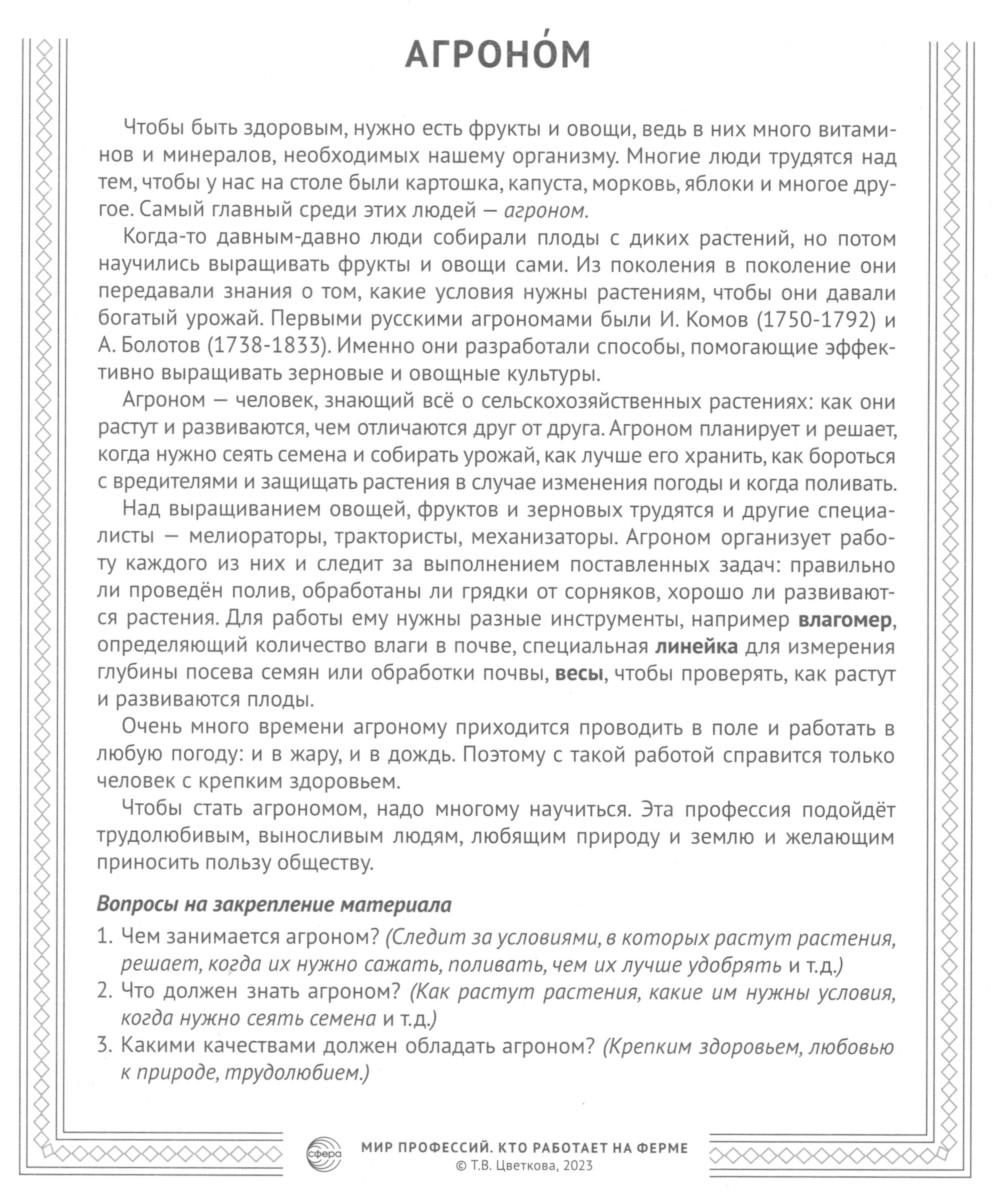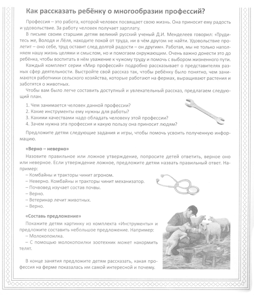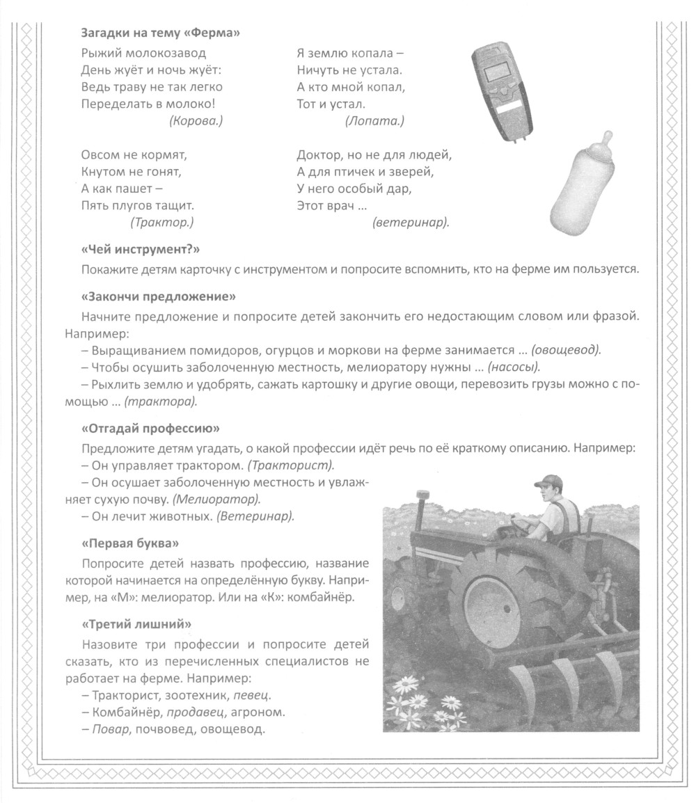 Издательство «ТЦ Сфера» представляет комплект серии «Мир профессий» под названием «Кто работает на ферме». Он состоит из 12 цветных демонстрационных картинок и адресован детям и их родителям, желающим познакомиться с людьми различных профессий, работающих на современной ферме. На лицевой стороне каждой картинки даётся цветное изображение представителя определённой профессии, на обратной - подробное описание, из которого дети узнают, какой техникой и каким оборудованием пользуется работники фермы. Для лучшего закрепления материала приводятся вопросы по каждой теме. Дополнительно в комплект входят 20 разрезных мини-карточек с изображением оборудования и инструментов, которыми пользуются работники фермы, и заданиями на обороте. Комплект подходит для индивидуальной и групповой работы, может использоваться на тематических викторинах и вечерах, посвящённых разным профессиям.| Издательство | Творческий центр Сфера |
