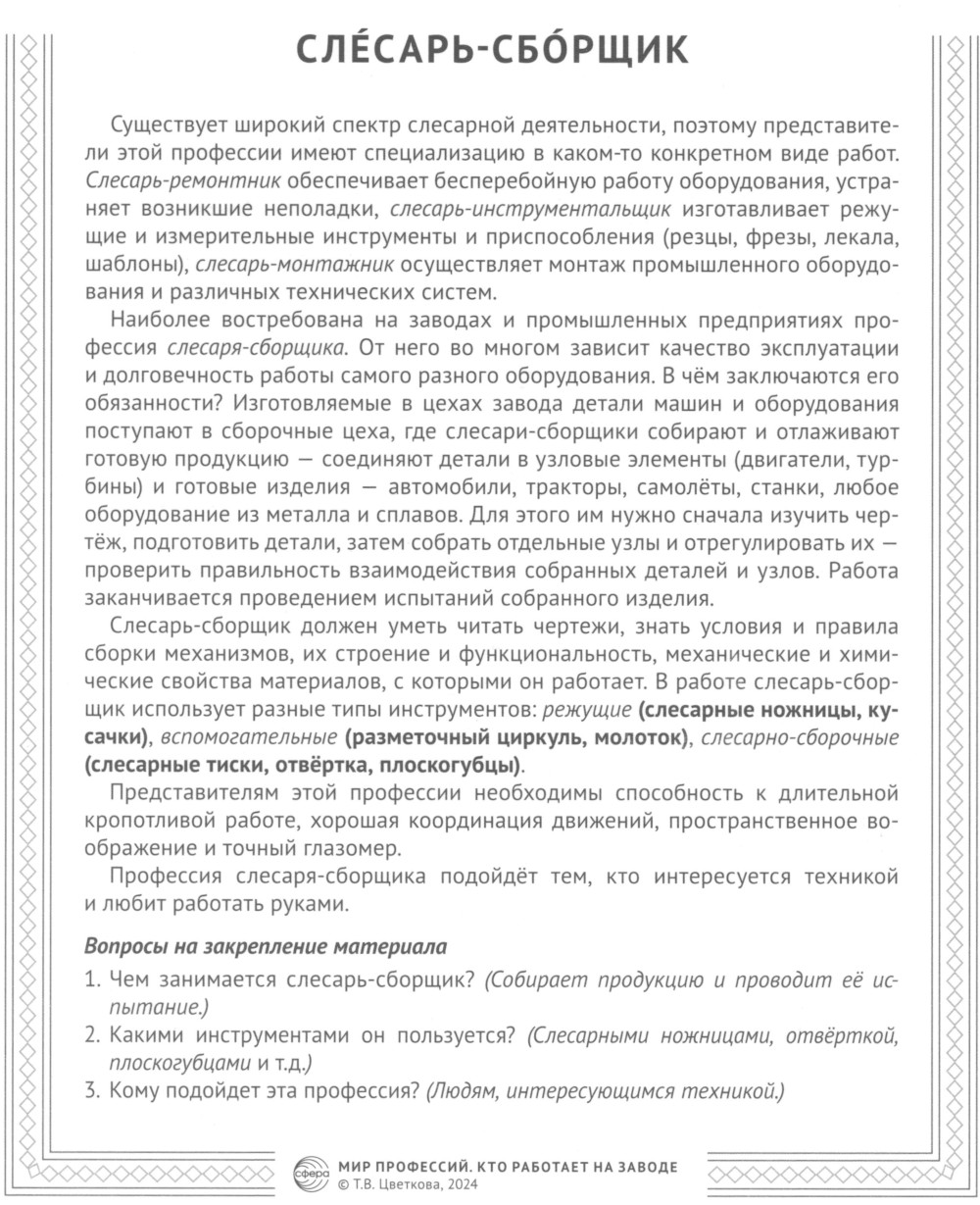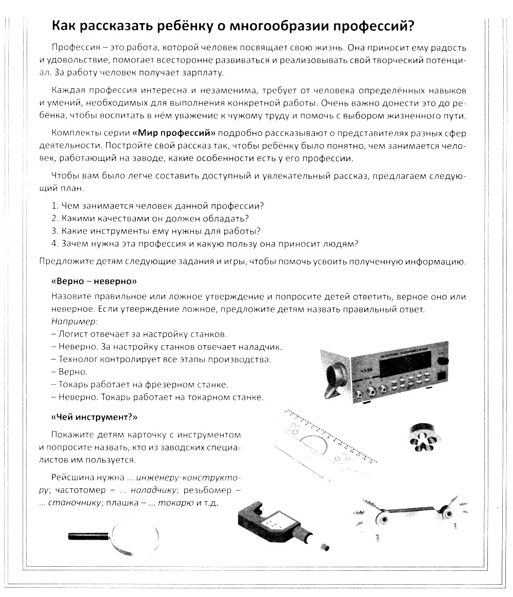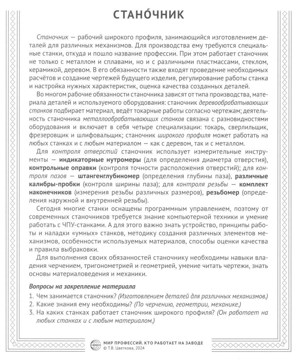 Издательство «ТЦ Сфера» представляет комплект серии «Мир профессий» под названием «Кто работает на заводе». Он состоит из 12 цветных демонстрационных картинок и адресован детям и их родителям, желающим познакомиться с людьми, работающими на современном заводе, узнать много интересного и поучительного об их специальности и особенностях профессии. На лицевой стороне каждой картинки даётся цветное изображение представителя определённой профессии, на обратной - подробное описание, из которого дети узнают, какими инструментами пользуется каждый специалист. Для лучшего закрепления материала приводятся вопросы по каждой теме. Дополнительно в комплект входят 20 разрезных мини-карточек с изображением инструментов и оборудования и заданиями на обороте. Комплект подходит для индивидуальной и групповой работы, может использоваться на тематических викторинах, посвящённых различным профессиям.