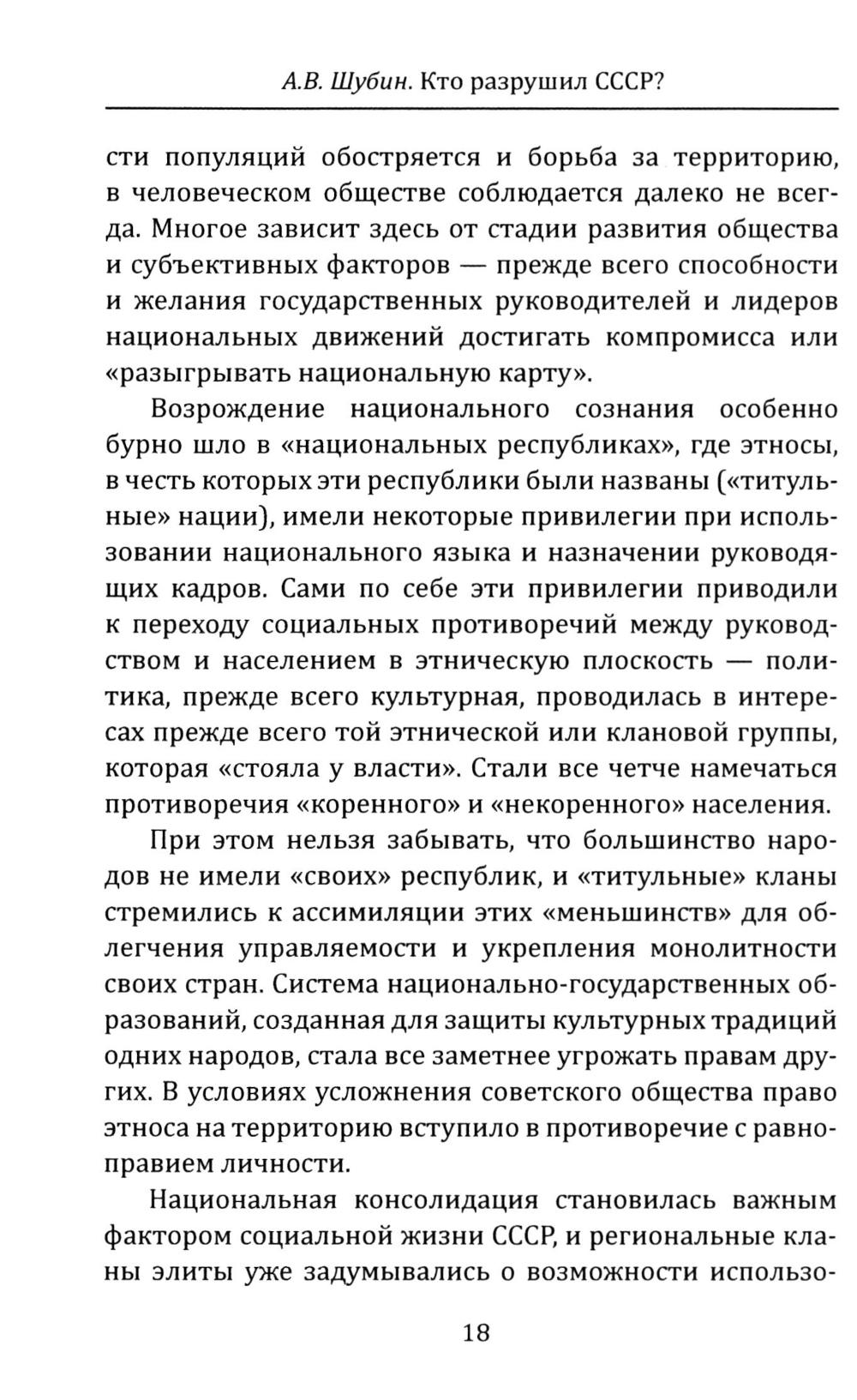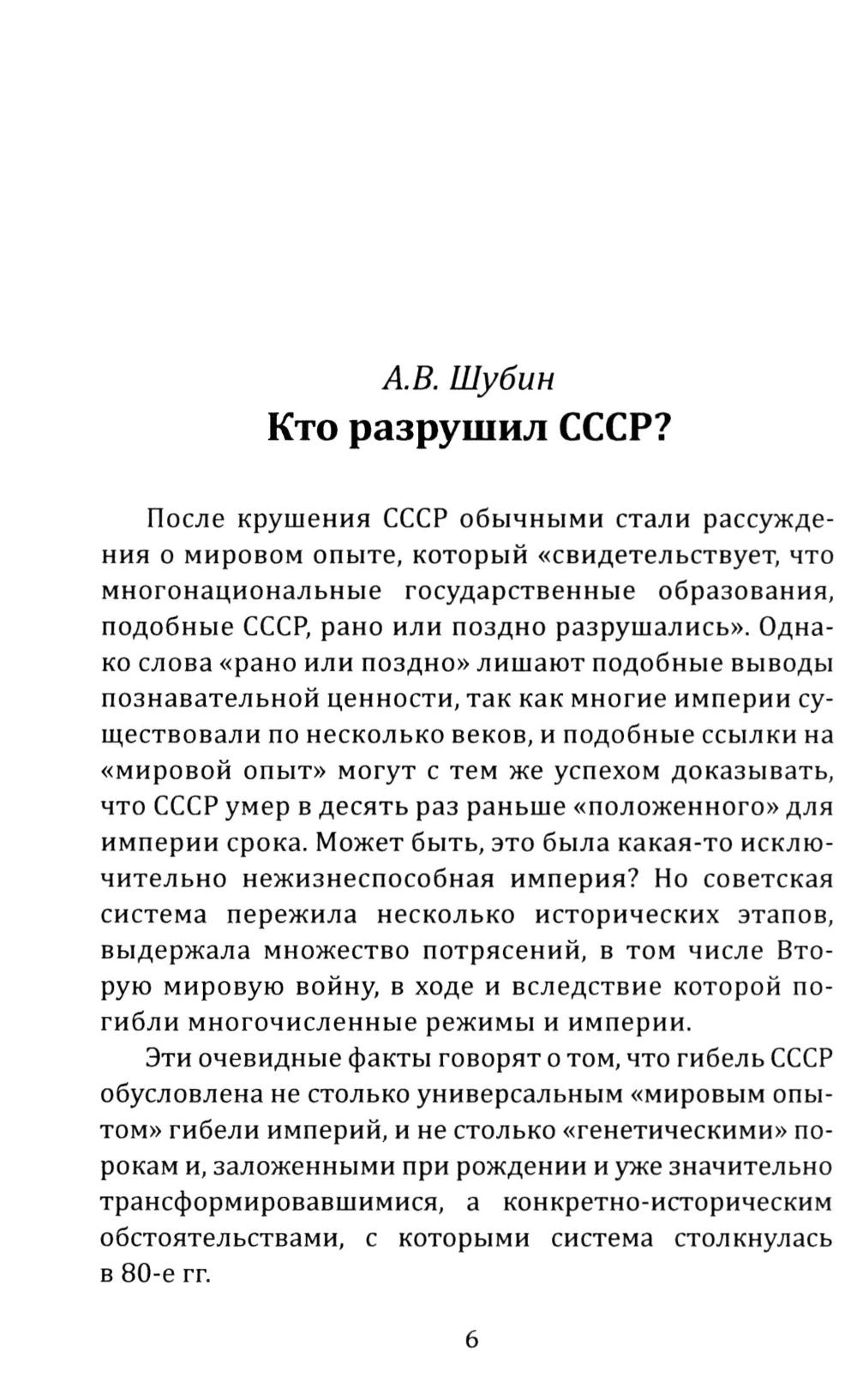 «Анализ причин развала Советского Союза напоминает расследование по делу о внезапной и таинственной смерти, где не берется во внимание возможность убийства и не делается попытки изучить обстоятельства данной смерти. Но даже если жертва была больна неизлечимой болезнью, следователь обязан изучить все возможное», - эти слова приводит в своей книге известный российский историк Александр Шубин. Он разбирает разные версии крушения СССР: национальный и социальный кризисы, поражение в «холодной войне», влияние Запада, субъективные факторы и приходит к определенному выводу о виновниках этой катастрофы. Книга дополнена собранным автором большим фактическим материалом о событиях конца 1980-х - начала 1990-х годов.| Издательство | Родина |