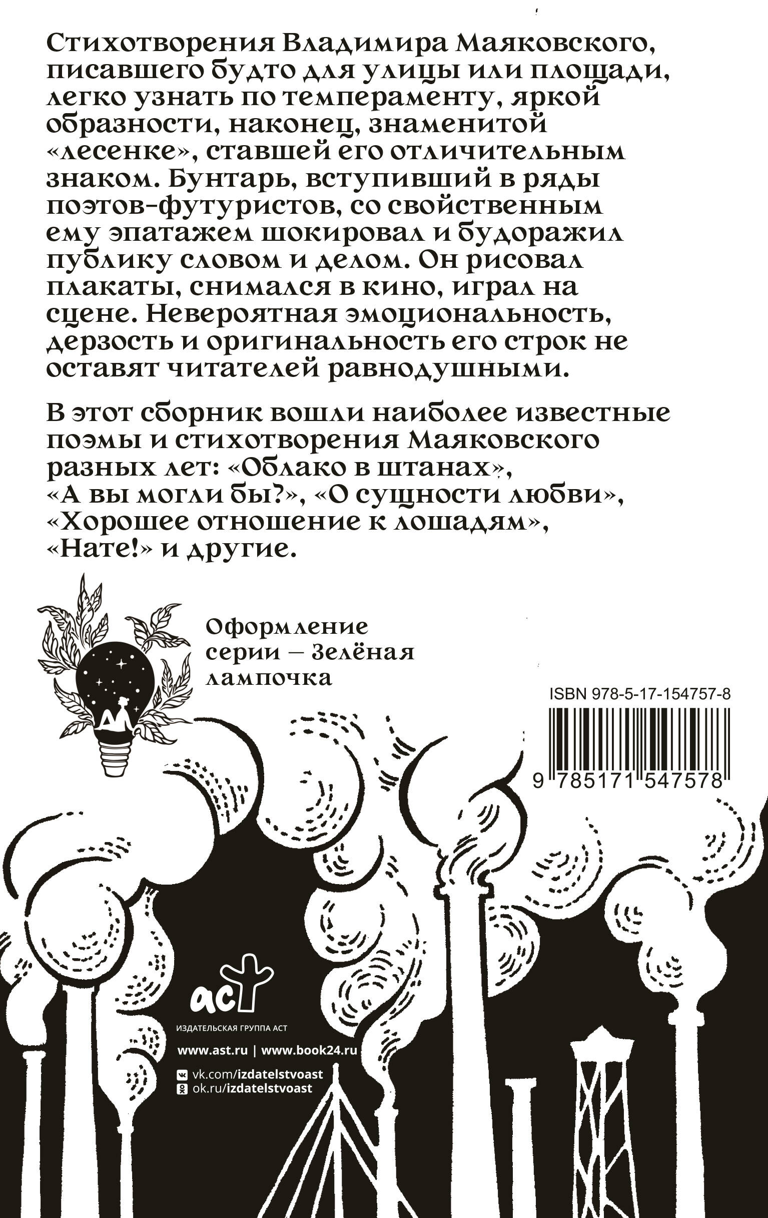 Стихотворения Владимира Маяковского, писавшего будто для улицы или площади, легко узнать по темпераменту, яркой образности, наконец, знаменитой "лесенке", ставшей его отличительным знаком. Бунтарь, вступивший в ряды поэтов-футуристов, со свойственным ему эпатажем шокировал и будоражил публику словом и делом. Он рисовал плакаты, снимался в кино, играл на сцене. Невероятная эмоциональность, дерзость и оригинальность его строк не оставят читателей равнодушными. В этот сборник вошли наиболее известные поэмы и стихотворения Маяковского разных лет: "Облако в штанах", "А вы могли бы?", "О сущности любви", "Хорошее отношение к лошадям", "Нате!" и другие.| Издательство | Издательство "АСТ" |
