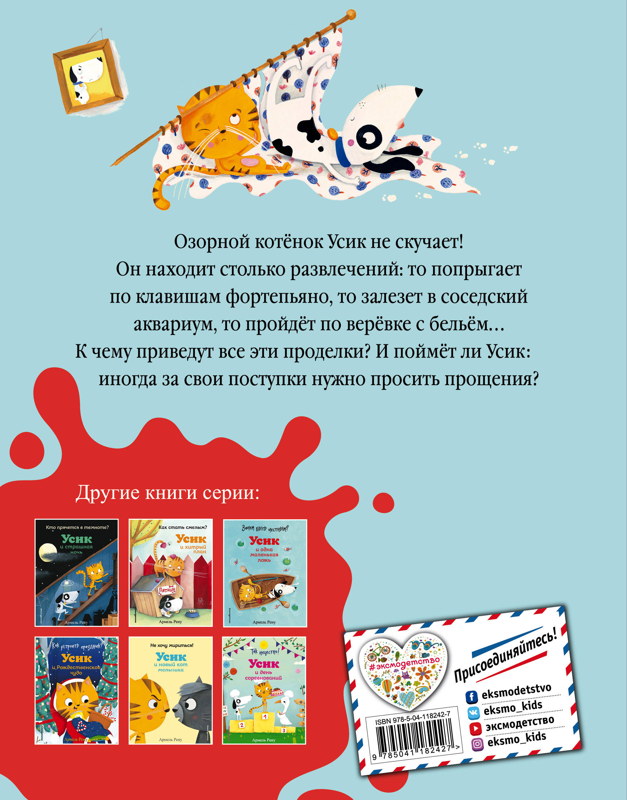 Озорной котёнок Усик не скучает! Он находит столько развлечений: то попрыгает по клавишам фортепьяно, то залезет в соседский аквариум, то пройдёт по верёвке с бельём. К чему приведут все эти проделки? И поймёт ли Усик, что иногда за свои поступки нужно просить прощения? Котенок Усик станет любимым героем вашего малыша на целых семь книг серии! Этот проказник знает, как развеселить друга, придумывает хитрые планы и отправляется в путешествие к новым друзьям. С ним нескучно и приятно провести вечер, слушая мамино чтение, или даже прочитать небольшие истории самому!| Издательство | ООО "Издательство "Эксмо" |